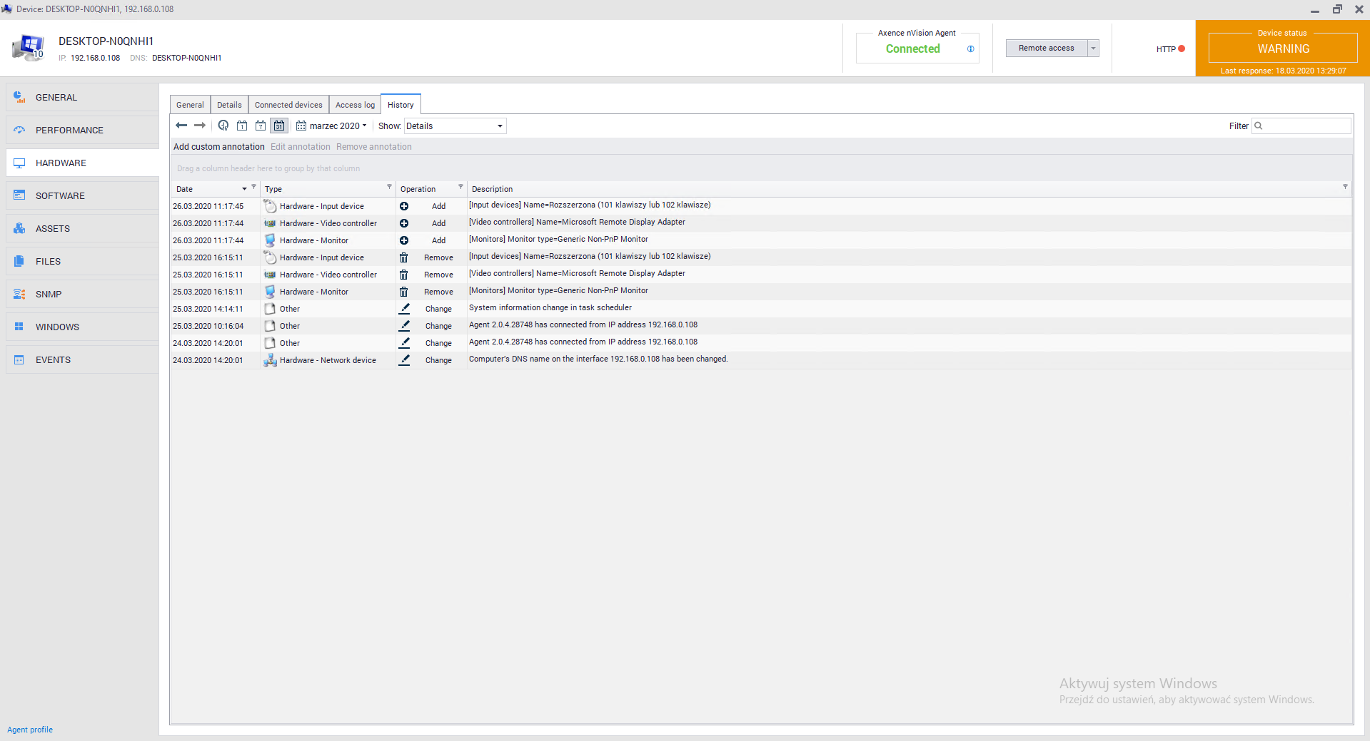 The history of all modified devices with installed Agent is described in the History chapter. |