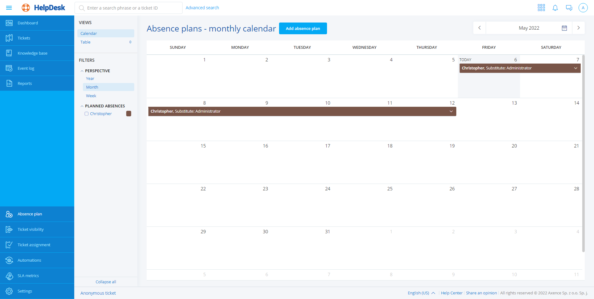 The absence plan is a system for reporting the absences of HelpDesk Administrators and Employees. The purpose of the function is to plan the appropriate ticket system operation when the person assigned to ticket handling is absent. Absence plan does not support vacation management, understood as calculating the number of vacation days eligible for an individual employee. Absence times (start/end dates and hours) pertain to the local time of the machine where the Axence nVision® Server (HelpDesk service) is installed.