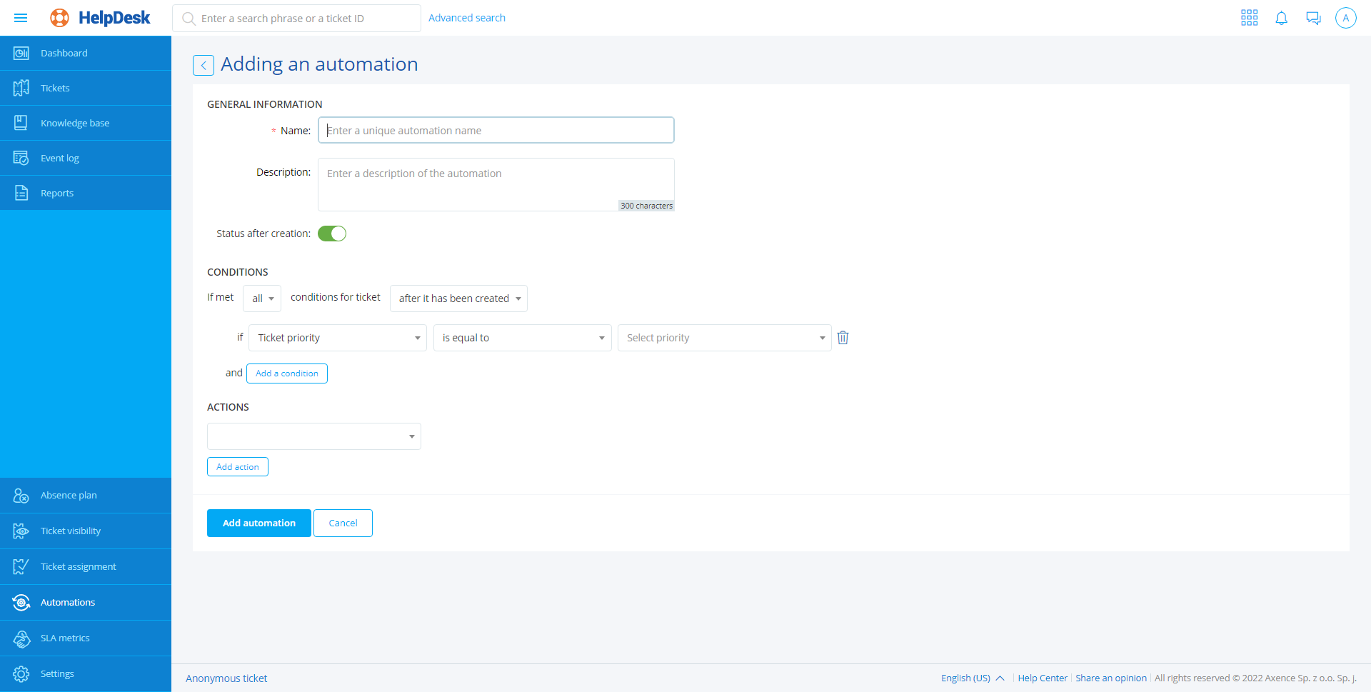 The automation addition view enables the determination of the conditions and actions which are to be performed in a specified situation. To add an automation: 1.Log in to the HelpDesk interface. 2.In the main navigation, on the left-hand side of the interface, select Automations. 3.In the automation list click the Add automation button. 4.Fill in the fields: •name – specify the name of the new automation, •description – you can add a short description of the automation operation. 5.Determine the automation status after it has been created. 6.Specify the automation trigger type – when it should be performed: •daily – an automatic procedure for checking the list of unclosed tickets is launched every day. Within its operation, the conditions defined by the administrator are checked and determined actions are taken. Example: Set the status to “Closed” for tickets not updated for 14 days. •after a new ticket has been created, •after a ticket has been updated. 7.Define the condition application logic: You can specify whether in order for the automation to be applied, the processed ticket should meet any or all of the conditions defined below. To add another condition, click the Add condition link. 8.Specify the actions which are to be taken, if the trouble ticket meets the conditions: To add another action, click the Add action link. 9.Save the automation by clicking the Add automation button. |