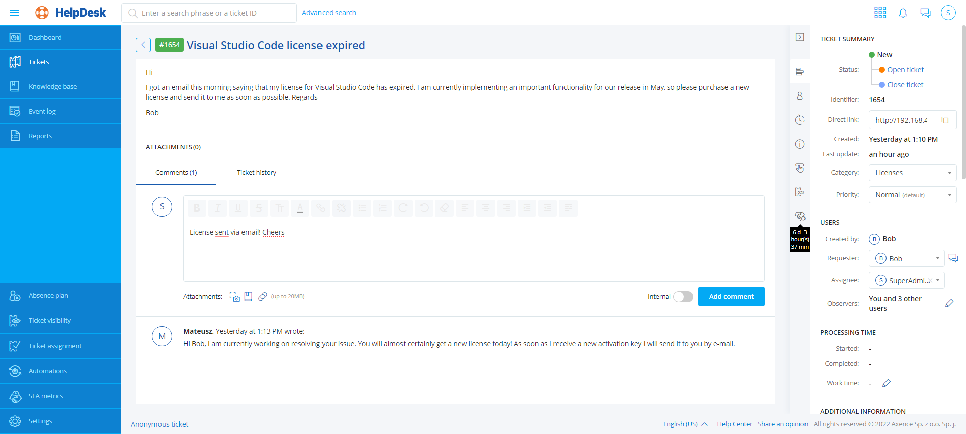 To add a comment to the ticket: 1.In the Tickets view click the ticket you want to process. 2.Enter a comment in the embedded text editor in the field below the ticket description. 3.You can Add attachment to the ticket. 4.You can Add screenshot if the Agent is installed on the device. 5.By default, the form is set to publish internal comments (orange background), which are visible only to Administrator and HelpDesk users. If a comment is to be visible to end users (white background), uncheck the Internal field. An end user can only add public comments. 6.You can add a link to the Knowledge Base article (only the Administrator and the Helpdesk support employee). To do this, click the Select article button and enter the title or select the article you want to sublink from the list. In this way, you can sublink multiple articles. To finish, click the Select article button. 7.To publish the comment, click the Comment button. Related topics |