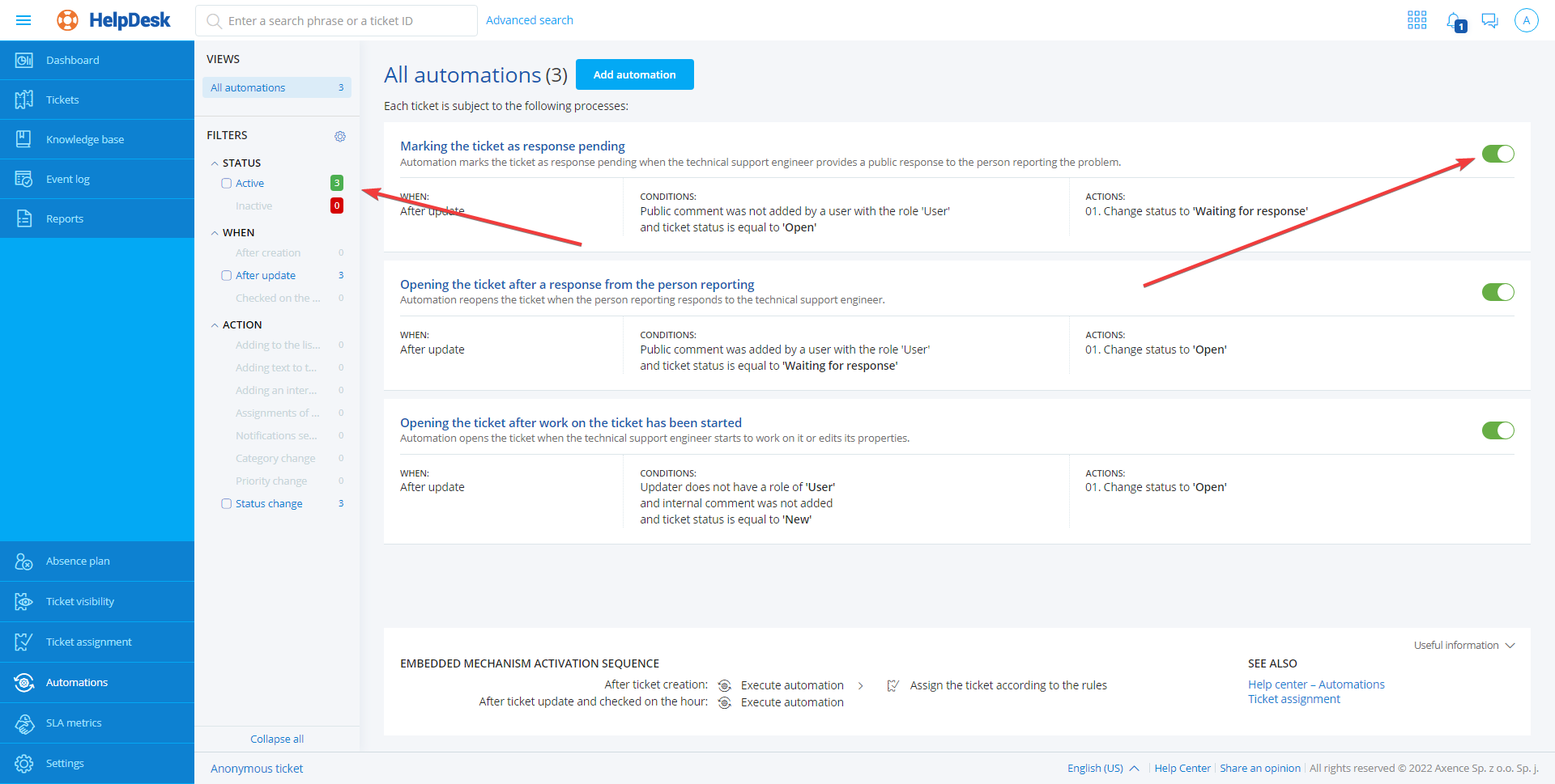 The created automations can be toggled off (deactivated) for a time when they should not be applied for trouble ticket processing, e.g. when the employee is on holiday. There is no need to remove the automation rule completely. To deactivate (or activate) an automation: 1.Log in to the HelpDesk interface. 2.In the main navigation, on the left-hand side of the interface, select Automations. 3.In the automation list select the one to be edited. 4.In the automation’s context menu (upper right corner of the tile) click the Deactivate link (or Activate, if the automation is already disabled). 5.Confirm the action in the dialog box by clicking the Deactivate (Activate) button.