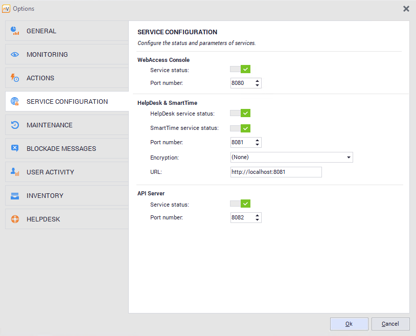 To configure secure access to the HelpDesk, navigate to nVision and remote access settings in the menu: Tools / Options / Remote web access. After the certificate has been specified, the URL address of the HelpDesk will be automatically changed to https://FQDN:port – you have to configure FQDN to suit it to the actual DNS name (for which the certificate was issued) – preferably then copy the URL and see if it opens in the browser. If the test pass with success, then you can accept the Options window by clicking [OK] button and the URL will be sent to Agents.