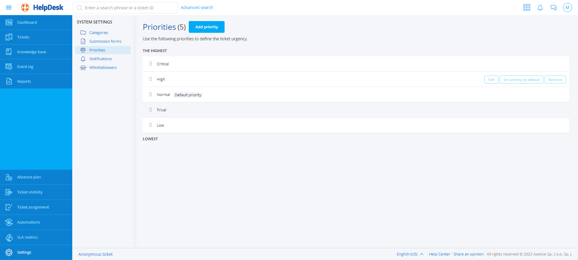Priorities allow the specification of the severity of the reported issue. The Administrator can manage the existing priorities and add new ones. When creating a ticket, User cannot select a priority - only Administrators and HelpDesk Employees may change this field. It is recommended to precede the names with digits, setting the priorities in ascending or descending order, so that after alphabetical sorting, their order of importance can be still easily identified. Note: exactly one default priority must exist at all times and cannot be deleted. Priorities are managed from the level of the HelpDesk web interface. To create a new priority: 1.Go to Settings / Priorities tab. 2.Click Add priority button. 3.Enter a new unique priority name and click Add priority.