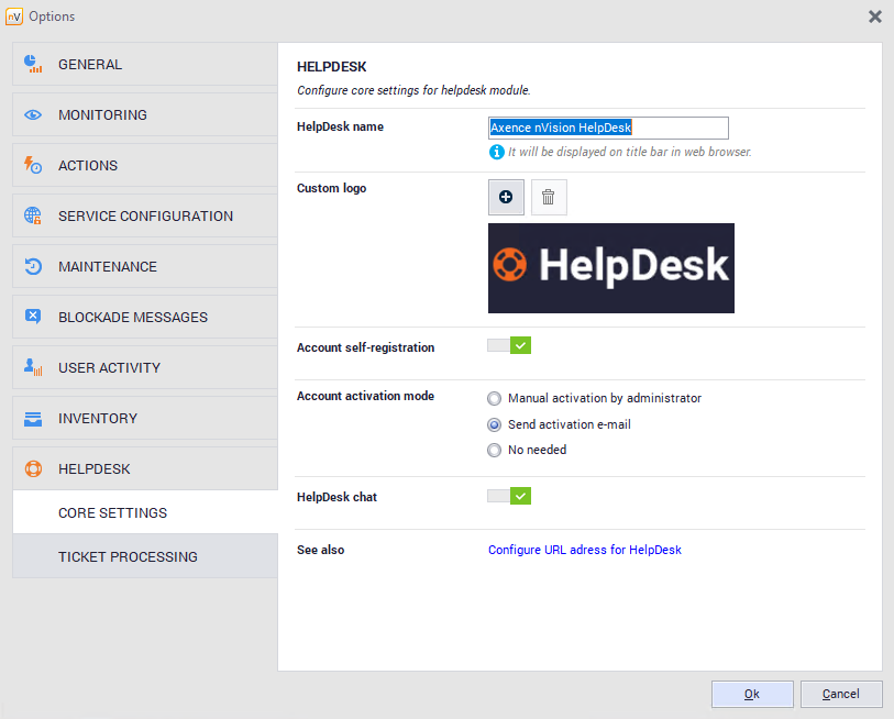 In order to manage the HelpDesk settings, in the main nVision window expand the menu and enter Configuration, HelpDesk tab. Settings are located in two groups: •Core settings •Ticket processing