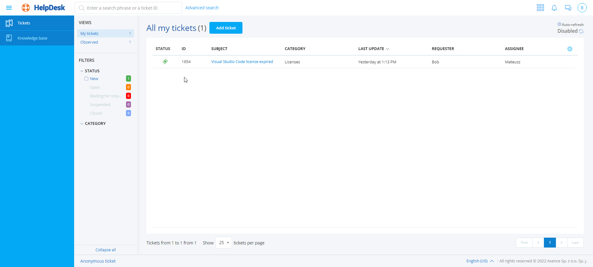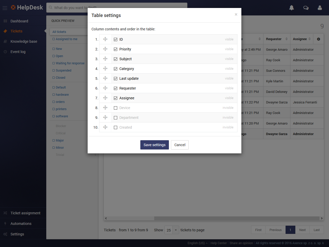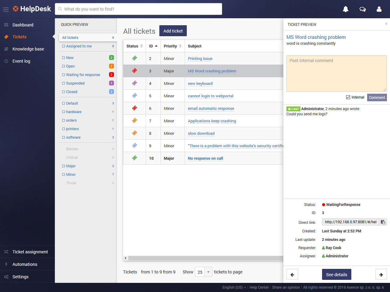 The ticket list is one of the main views of the HelpDesk interface. It shows information about trouble tickets sent to the HelpDesk system. In the left part of the window, there is the main navigation (see Main views) and the quick preview column. The quick preview allows you to rapidly display a data set from the specific area of interest. For instance, you can display new highest-priority tickets, which additionally belong to one of two selected categories. Ticket list table The main part of the described view is the ticket list table. It contains the following columns: •Status (color marking on the left-hand side of the table line) •ID •Date of SLA violation •Priority •Ticket subject •Category •Related device (column hidden in the Administrator view) •Department (column hidden in the Administrator view) •Date of creation (column hidden in the Administrator view) •Date of last update •Full name of the assignee •Full name of the requester To select the displayed columns or their sequence in the table, click the table settings button [gear icon] in the upper right corner of the table. To sort the table contents by a given column, click the arrow at the column name. Below the table you can select how many tickets are to be displayed per page, and also go to the next pages. Important: Unread tickets are in bold font. Ticket preview Click the ticket icon or line on the right-hand side of the interface to open a quick preview of the ticket. The quick preview displays the title and the short ticket excerpt, and the action block. The block enables you to quickly and comfortably add an internal or public comment to the ticket. Below, the last comments, short ticket summary and the navigation bar are shown. To go the detailed ticket view at once, click its subject. Related topics |