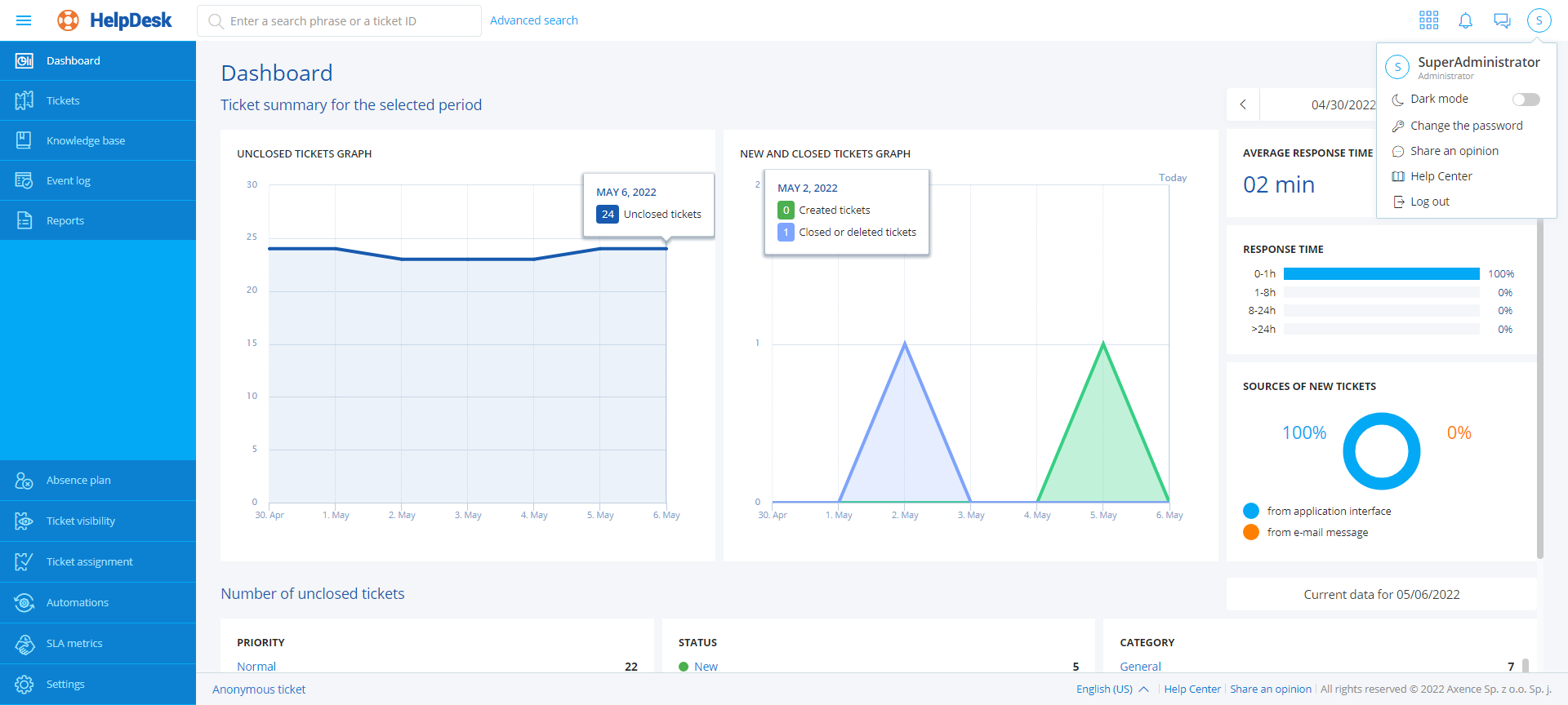 •Help Center (Administrator and HelpDesk employee) •Change password •Log out |