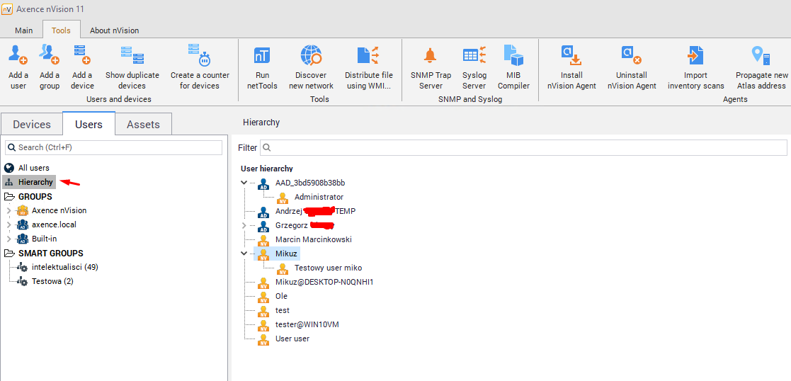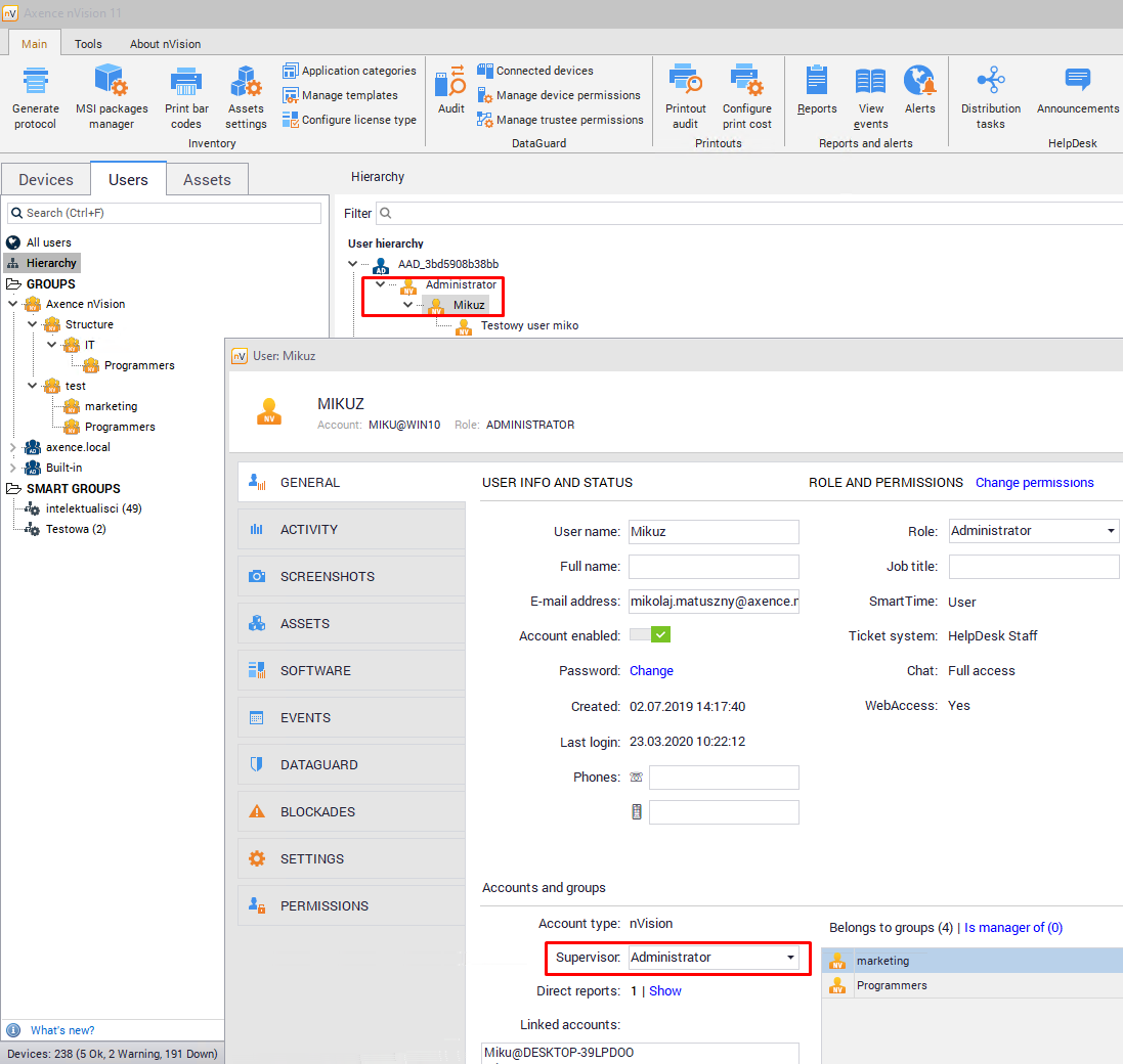 The hierarchy of users was introduced in version 11 of nVision. It enables to determine the relationships among users. Each user has the “superior” field, which may be left blank or contain exactly one user. The hierarchy of users is built only based on the relationships contained in this field. Any users that do not have a superior are located on the root level, but there is no relationship among them in the hierarchy. This feature is closely related to the SmartTime module where a user that is higher in the hierarchy (superior) may have access to specific activities of a user that is lower in the hierarchy (subordinate). For more information about this relationship, refer to SmartTime chapter. To view the hierarchy of users, click the Hierarchy button in the Main / Users tab: Creating a hierarchy The hierarchy of users can be created in two ways: The first one is to drag and drop users in the hierarchy view. Please note that you cannot change the superiors/subordinates of the users downloaded from Active Directory. The second way is to define the superior in the user information screen. To do this, navigate to this screen for the selected user and modify the “superior” field: |