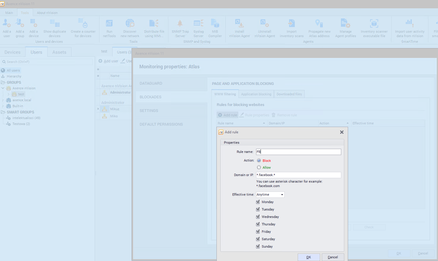 Websites can be blocked for a workstation with an installed nVision Agent by means of Agent profiles. By default, all websites can be accessed. To enable blocking, toggle on the integration with TCP/IP stack in the Compatibility and performance tab. To learn how to do this, see the chapter I cannot block websites. The following protocols are supported at the moment: HTTP, HTTPS, SMTP:25, SMTP:587, SMTP via SSL, POP3 via SSL and POP3:110. The following protocols are not supported at the moment: IMAP, MAPI. Blocking access to websites The model blocking settings are presented in the Blocking settings chapter. To block access to a website: 1.Navigate to the Atlas information, Group information or User information window. Switch to the Blockades tab. 2.Select the Web filtering page. 3.Click the Add rule button. 4.Enter the rule name, select the Block action and enter an IP address or domain to be blocked. An example of the rule is shown on the image below.