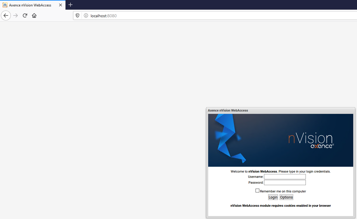 Warning! If Web access wasn't enabled prior to upgrading to nVision 14, it is no longer available. Browser access When the Web Access is toggled on in the manner described above, it is possible to use nVision by means of a Web browser. For this purpose, enter the IP address and port number of the machine running nVision in the browser address bar and then, after connecting to the access module, enter the user name and password to log in to nVision. Please notice that the Web Access is read-only, so no changes to nVision can be made through it. The option of optimization for weaker machines (login window, Options button) allows the operation of the nVision Web Access module on slower computers, but increases bandwidth usage. |