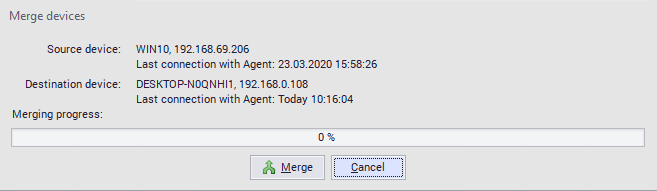 To merge hosts with Agents: 1.In the Hosts / Agents view, select hosts to be merged. 2.Right-click and select the Agent / Merge hosts option. The Merge hosts window will open. 3.To start the merging process, press Merge button. The old host will be removed from the map. |
