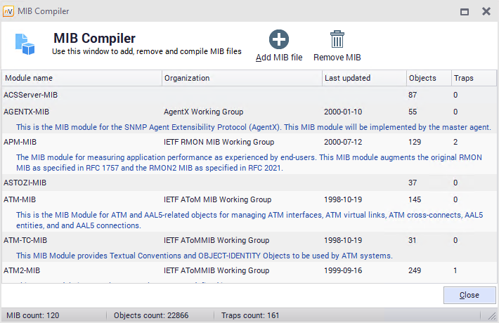 MIB compiler enables you to add new, remove and compile MIB files, which facilitates gathering SNMP information from all network devices: switches, routers, printers, VoIP devices etc. The program can now effectively monitor thousands of different SNMP devices. To use MIB compiler: •Select MIB compiler from the Tools tab on the ribbon. A MIB compiler window will open. 1.If you want to add a new file, click the add button. 2.Add a MIB module by clicking the add button and selecting a file from its localization. Compile log is shown after compilation. 3.You can also define aliases in the Aliases editor (the Atlases button). |