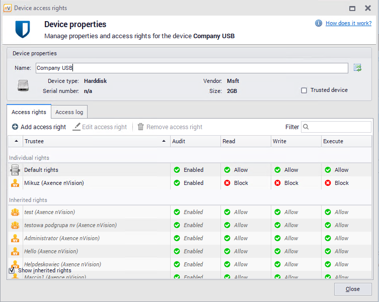 The rights for the specific workstation or map can be assigned directly or inherited from parent levels. These are displayed in the above mentioned sequence, i.e. first the individually assigned rights, then the inherited rights. What is more, inherited rights are marked in gray and italics. It allows you to distinguish at a glance, which rights are specific for the given workstation, and which are the result of the rights granted on higher levels. In the case of multiple maps and workstations, using the option of hiding inherited rights by means of the Show inherited rights button in the lower left corner of the device properties window is recommended. |
