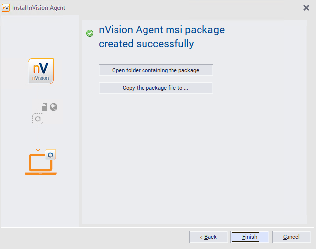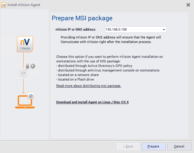 2.Give the IP address where the Agent will send its data to. By default, this is the address of the computer where nVision runs. However, if the Agent is installed on a computer working outside the company and the Agent will send the data through the Internet, enter here the public IP address or the DNS name of the router where the TCP 4434 port will be redirected to the nVision machine. The entered address is permanently stored in the MSI package built on the next step. To change the address, you need to rebuild the package. 3.Click one of the buttons, respectively, to open the folder with the prepared MSI installation package or to copy it to the specified folder. Related topics |