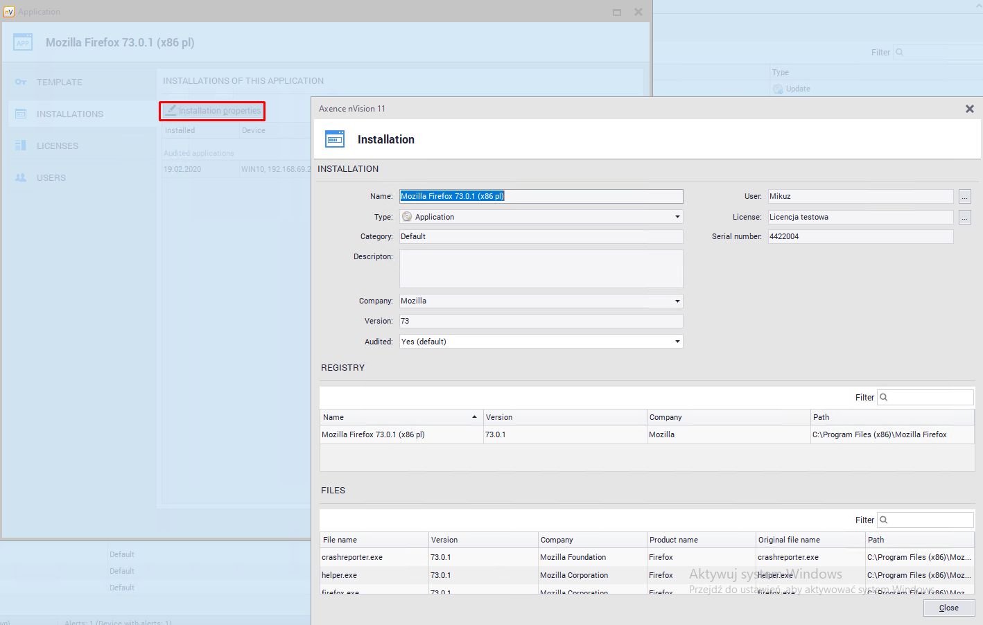 The Properties includes the Installations tab which presents information about detected application installations that are associated with the edited license: