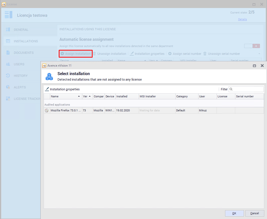 Adding instances If the automatic license assignment is enabled, new items will appear once the installations are detected. To manually add an installation associated with the license application, click the Assign installation button and select an item from the list: