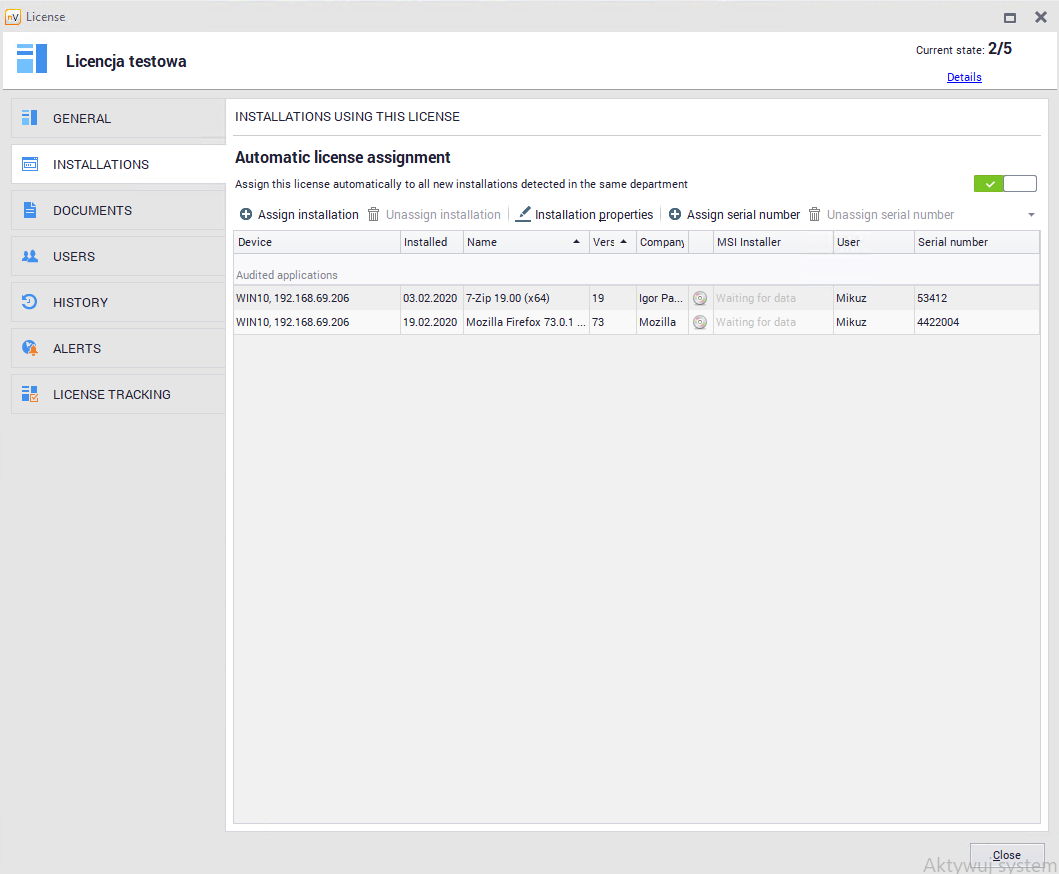 This function is described in app instances chapter. Assignment to installations A switch is available at the top of the installation tab window that allows you to automatically assign licenses to new detected installations. Turning it on will automatically add more items to the list of installations once they are detected.