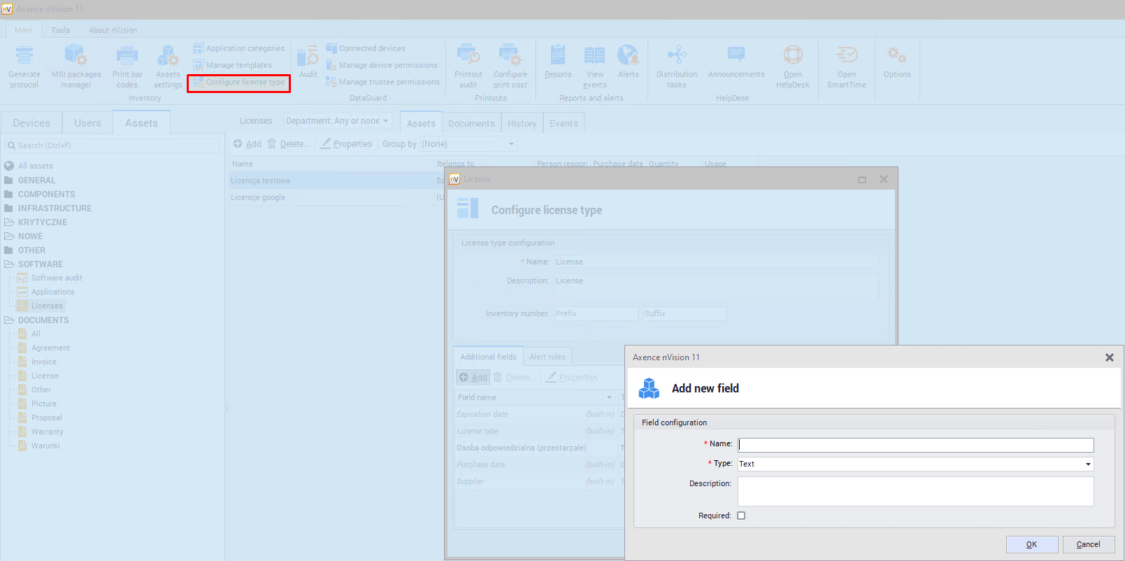 Additional fields for licenses To add an additional field for all licenses, select Configure license type on the main toolbar. This will open the configuration window where additional fields can be added: