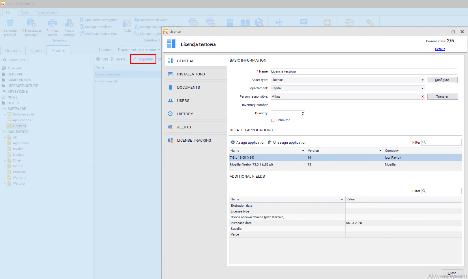 To access the License Properties window, select the Assets tab in the main program window, and then scroll down for Licenses in the Software section. After selecting an item from the list, click the Properties button or double-click on the selected license: