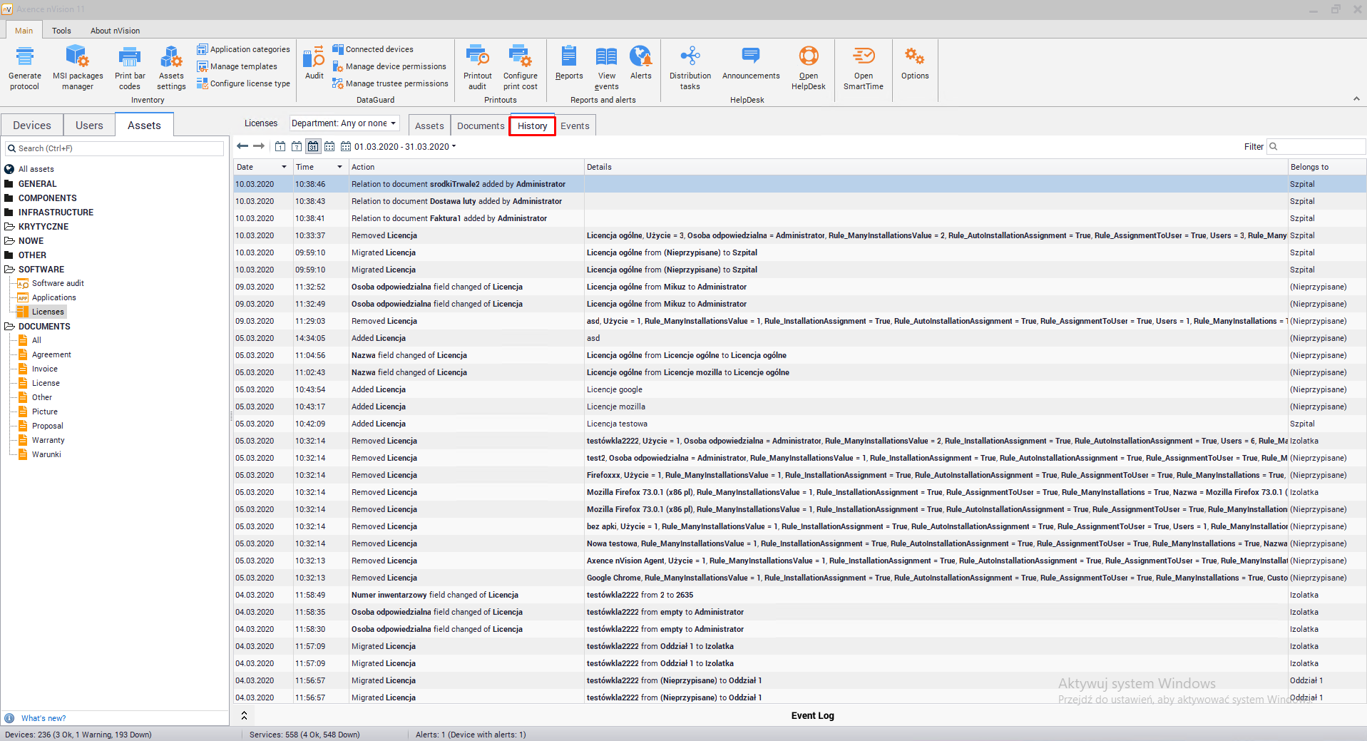 All licenses history To access the history of all licenses, select the Assets tab in the main program window, and then scroll down for Licenses in the Software section. The History tab will appear above the license list: