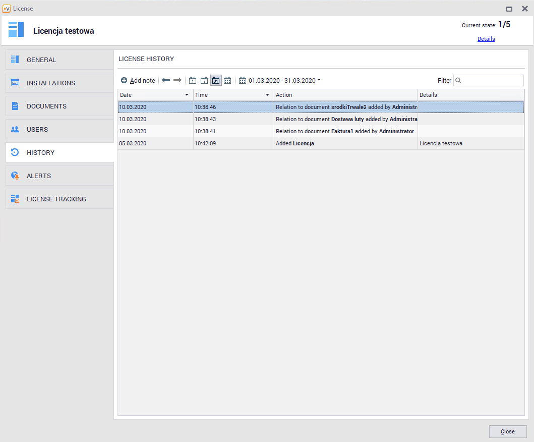 License History feature allows you to collect information about license modifications. To view the history, select the History tab visible in the License properties window: