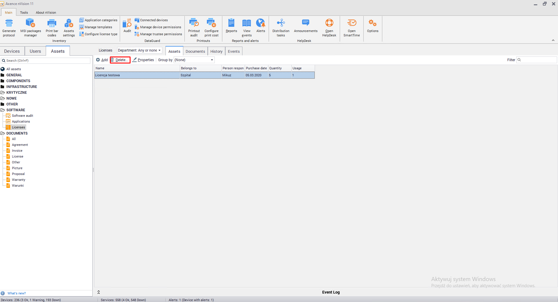 To remove a license, go to the Assets tab in the main program window, and then scroll down for Licenses in the Software section. After selecting the item to be deleted, click the Delete button above the license list: Removing the license will result in deleting all assignments to other objects. If installations or users were assigned to the license, these associations will be removed.
