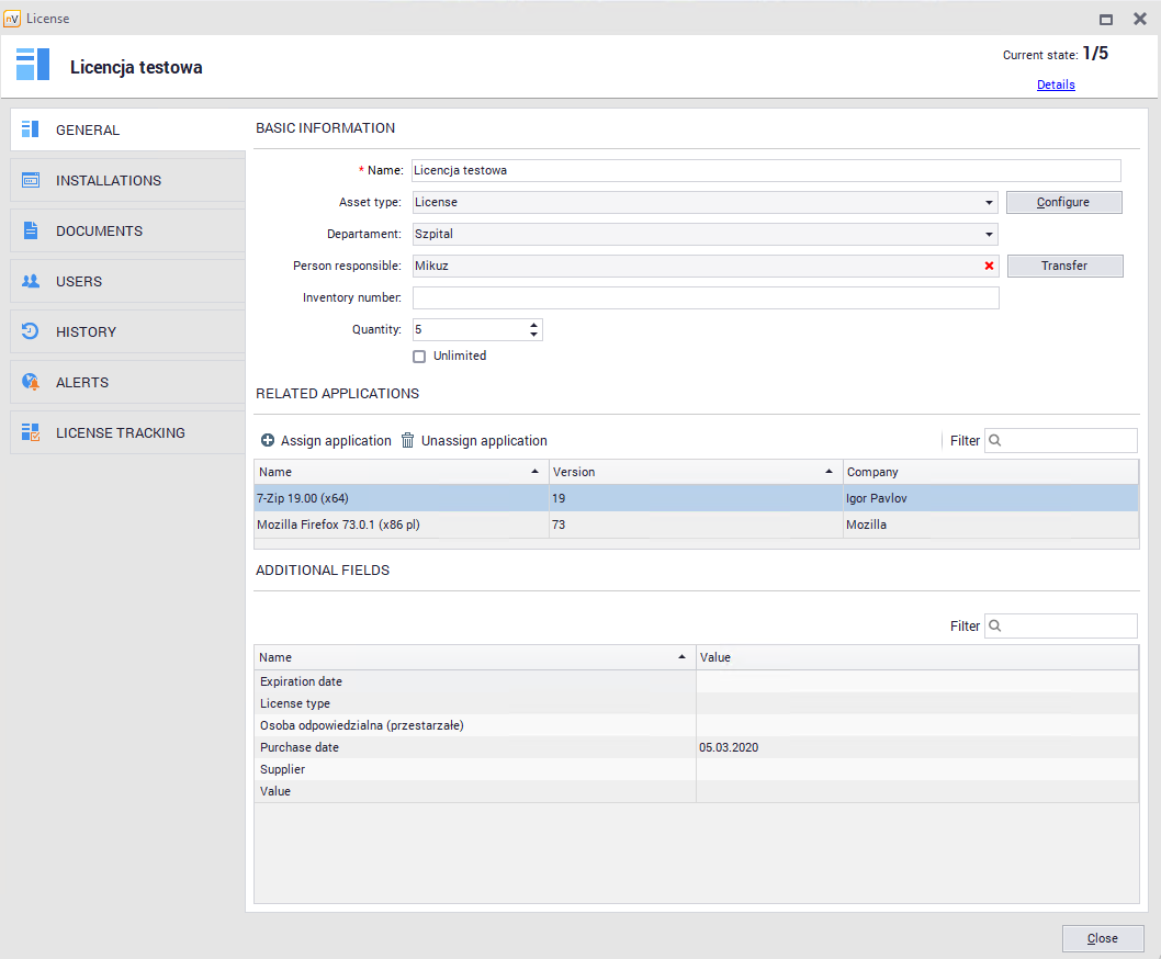 Removing assigned applications Removing the application associated with the license will result in removal from the license properties of the installation and other entries related to the application. To remove an associated application, remove the selected item from the list of related applications in the license properties window: |