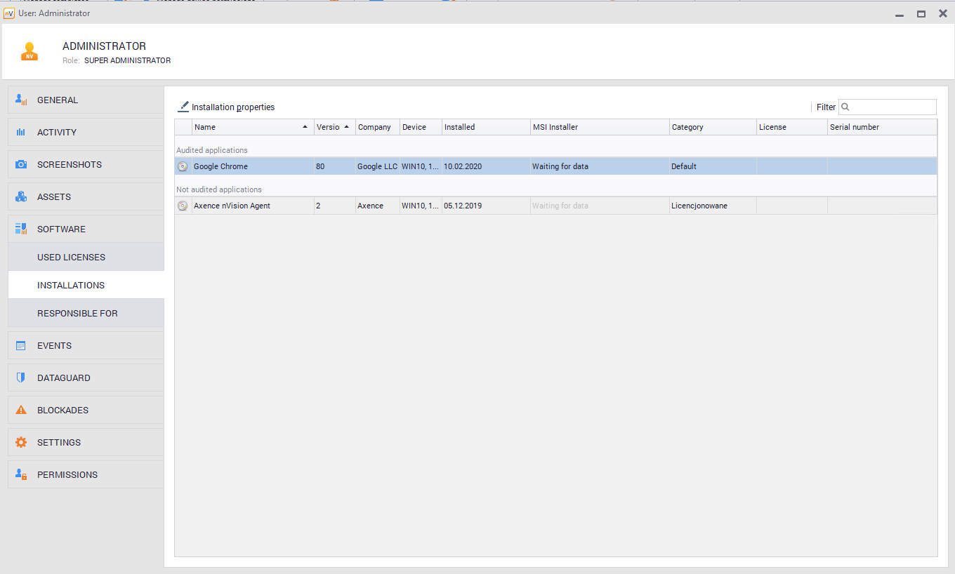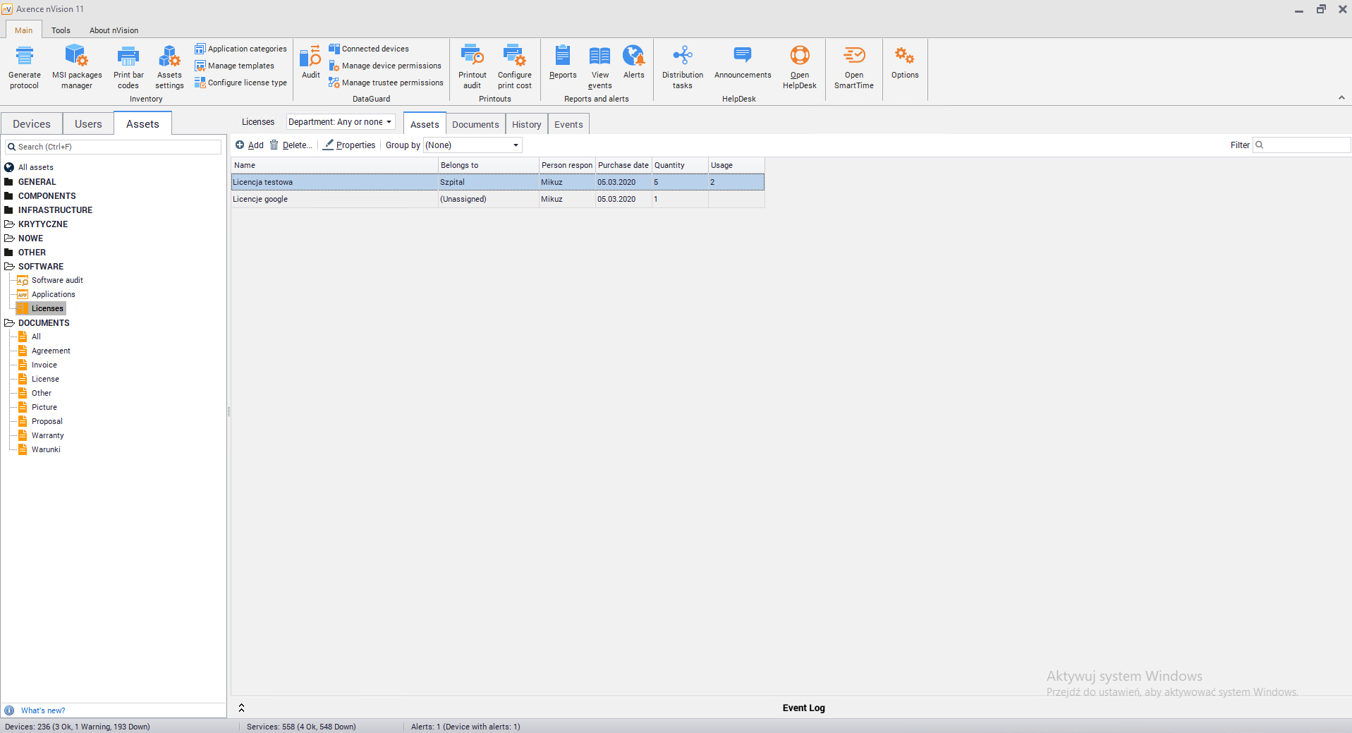 To display licenses list, go to the Assets tab in the main program window, and then scroll down for Licenses in the Software section. List displayed all licenses added to nVision:
