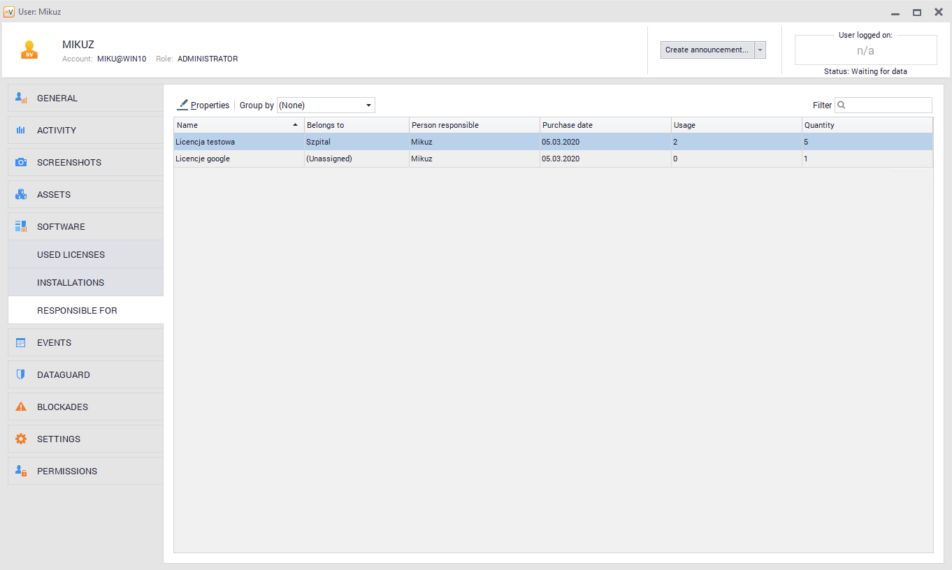 To view the licenses for which the user is responsible, go to user information window and then select the Software / Responsible tab: