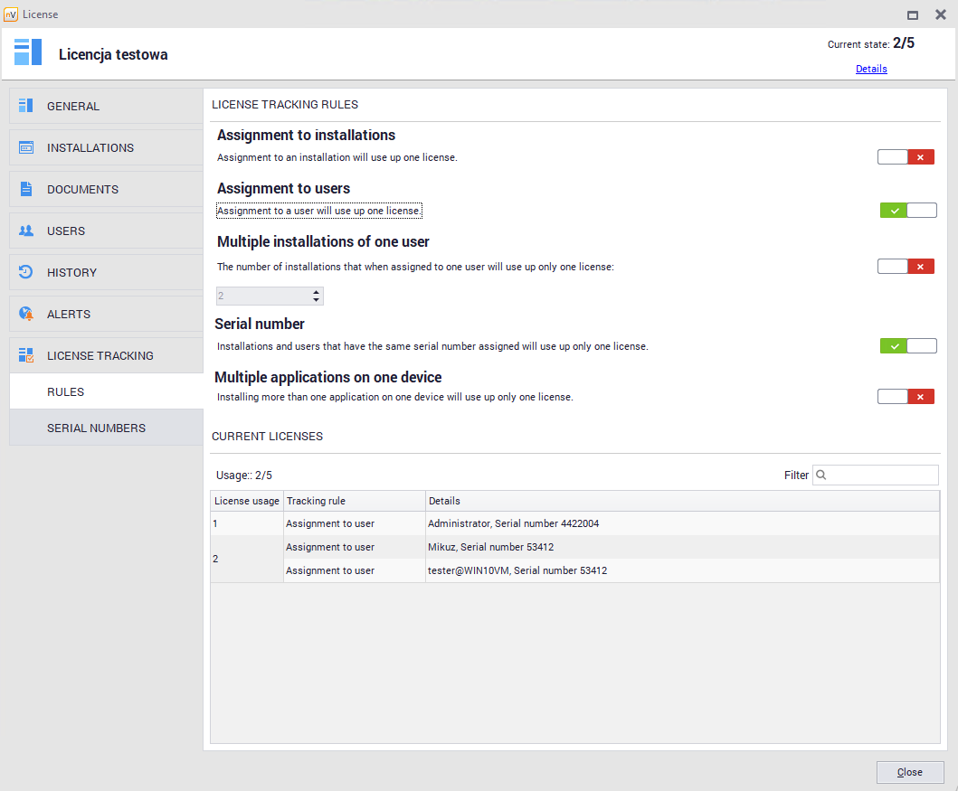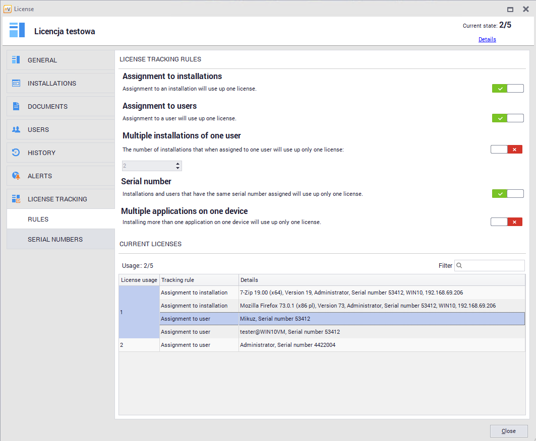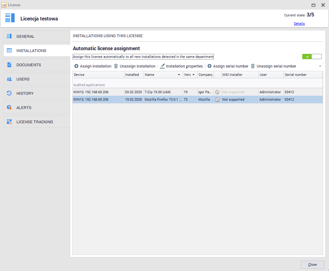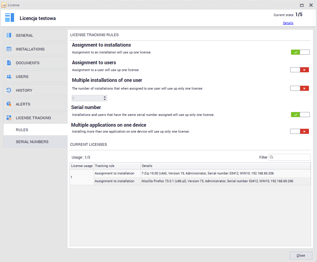 To assign a serial number to installation, go to Installations tab, selected item and click Assign serial number. License Tracking / Rules tab allows you to set rules for: •installations with assigned same serial number