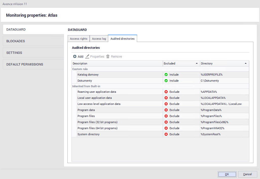 Defining the directories to be audited is done by the user (suchlike defining access rights to monitored devices), user group and Atlas level: