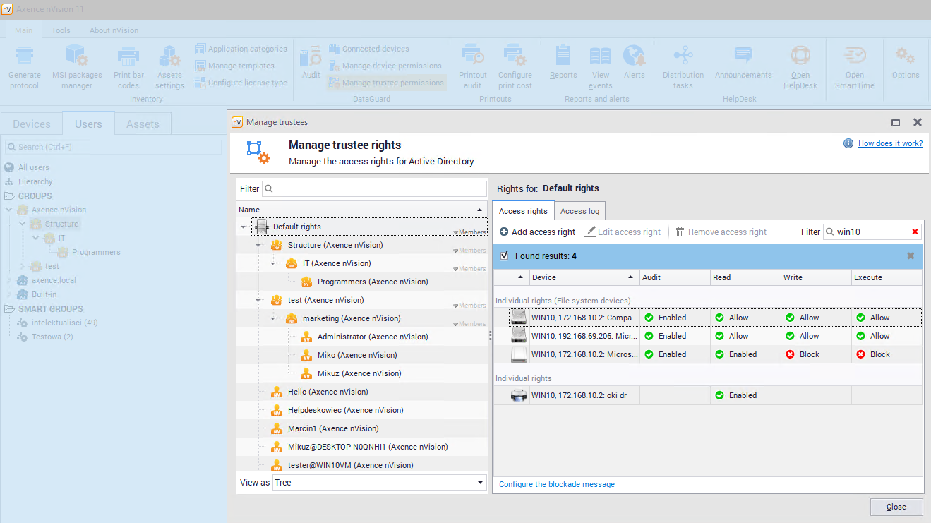 To manage the access rights to all units: 1.In nVision’s main toolbar, select the Manage trustees option from the DataGuard section. 2.Select a unit in the list on the left side. If necessary, use the search function to find the appropriate unit quickly. 3.To change the previously defined rule, double-click the row with the chosen rule in the right part of the window or select the row and click the 4.Use the list to select a device for which you will assign the rights. 5.Set the access rights and press Enter. The rights assigned individually can also be edited directly in the management window. For this purpose, click the selected right to change it. Clicking the inherited access rights will open the Define access rights window.