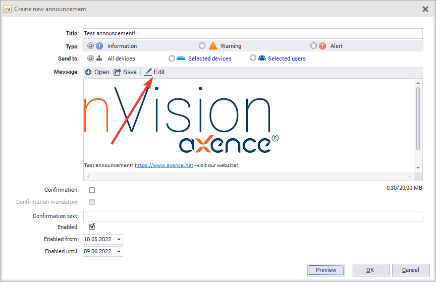 To edit the Announcement field in the message, click the Edit button in the message creation window. |