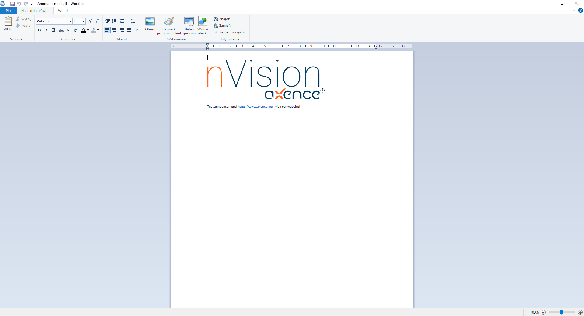After clicking, WordPad will open in a new window where you can edit the message, e.g. by adding an image, link, attachment (for instance by dragging a file into the word processor), or by formatting the message text, etc. |