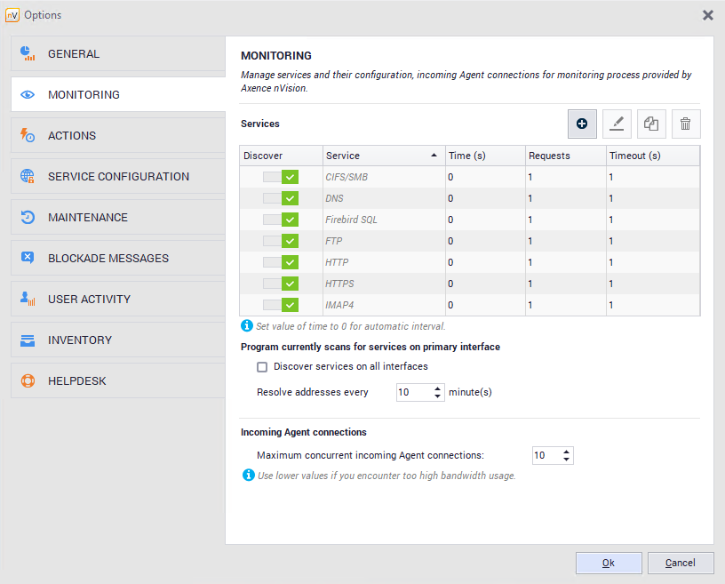 How services are detected and monitored nVision monitors UDP/TCP services based on a predefined set of rules. It not only checks if the specific port is open, but sends a request and waits for a response. Then, the response is examined to meet specific criteria. Only those services where a response is valid are considered as properly functioning services. The same mechanism is used to discover services running on hosts. It ensures that services are not mistakenly discovered when any service is running on the port supposed to be for another one. For example if FTP would be running on port 80, nVision will not discover service HTTP, as the response is not valid as an HTTP response. Service down After a service stops responding, then it gets the status <Down>. You can see that as a red colorized icon in the service grid (available on the Services tab in the Host Info window). Leading service There is always one leading service for each host. This service is indicated by bold font in the service grid located in the Host info window. The leading service is the most important service of the host. Its response time can be presented on the host icon. How to monitor hosts and services? After discovering hosts in your network, nVision automatically scans for the most important services running on them. So, there is no need to take any further actions in addition to discovering the network to begin monitoring of hosts and their services. However, you can add a new service manually or by calling the service discovery tool. Adding services To add a new service to the default list of monitored services: 1.Go to nVision settings located on main toolbar. Navigate to the 2.If you want to add a service, click the add button and select the service that is to be monitored from the list. To manage the service definitions, click the Manage services button. Services on hosts A list of monitored services including charts that represent the response time and percent of packets/requests lost is available in the Host status window. For more information about services refer to Managing hosts topic. |