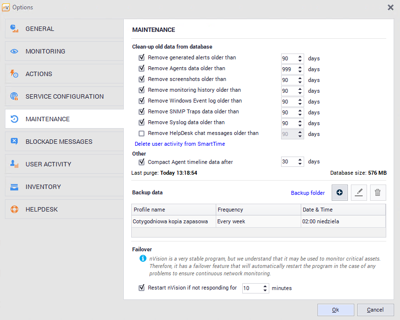 In case of a large number of Agents that send their data to nVision, perform the following actions to obtain high performance. More than 250 Agents 1.Navigate to the main program configuration and click the Maintenance tab. 2.Enable the Compact Agent timeline data after option. More than 1000 Agents 1.Navigate to the Settings window for the Atlas or group or to the User info window.
