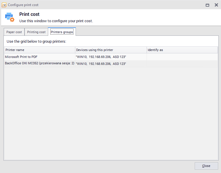 To reduce the number of entries and to avoid reporting printing costs for repeating devices, it is possible to group printers. The function is available in the Printers groups tab (the Configure printing costs window).