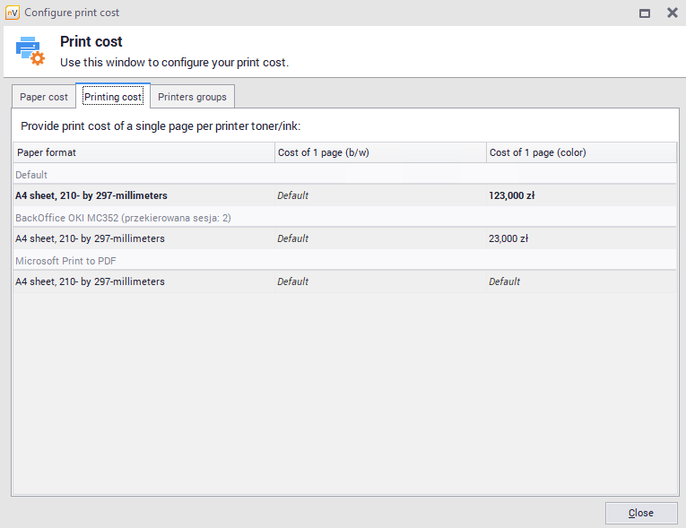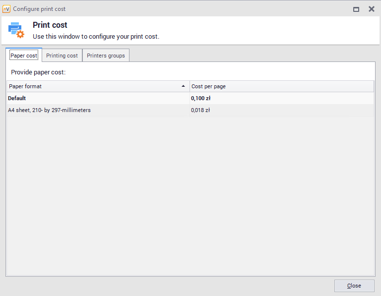 Printout monitoring allows the costs borne in relation to document printing to be discovered. To ensure the proper cost assessment, configure the expenses, including the costs of paper and printing on specific printers. Configuration To configure the printing costs: 1.Select Configure printing costs in the menu bar (in the Main page). You can also do this from the level of the Printout audit window by means of the appropriate button. In both cases the Configure print cost window will open. 2.In the Paper cost tab specify the costs for paper formats (A3, A4, A5, envelope). The cost specified in the Default cell will be used for all formats for which the specific cost is not determined.