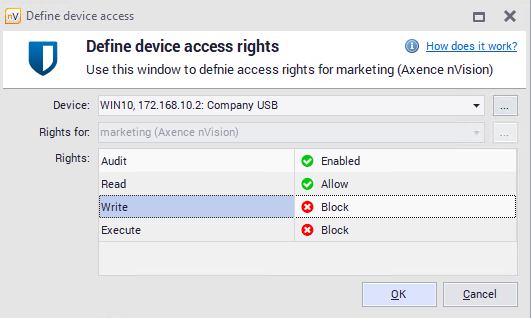 To set the default rights for specific groups and users or to check their settings: 1.In nVision’s main toolbar, select the Manage trustees option from the DataGuard section. 2.Use the list to select the group or user for which the changes will apply. 3.Select the device group Other USB storage devices marked with the If a user connects a blocked device, a pop-up with a notification about blocking will be displayed from the Agent icon. To learn more about flash drive blocking and setting access rights for specific devices detected by nVision, see section How to set the access rights to USB media?. |