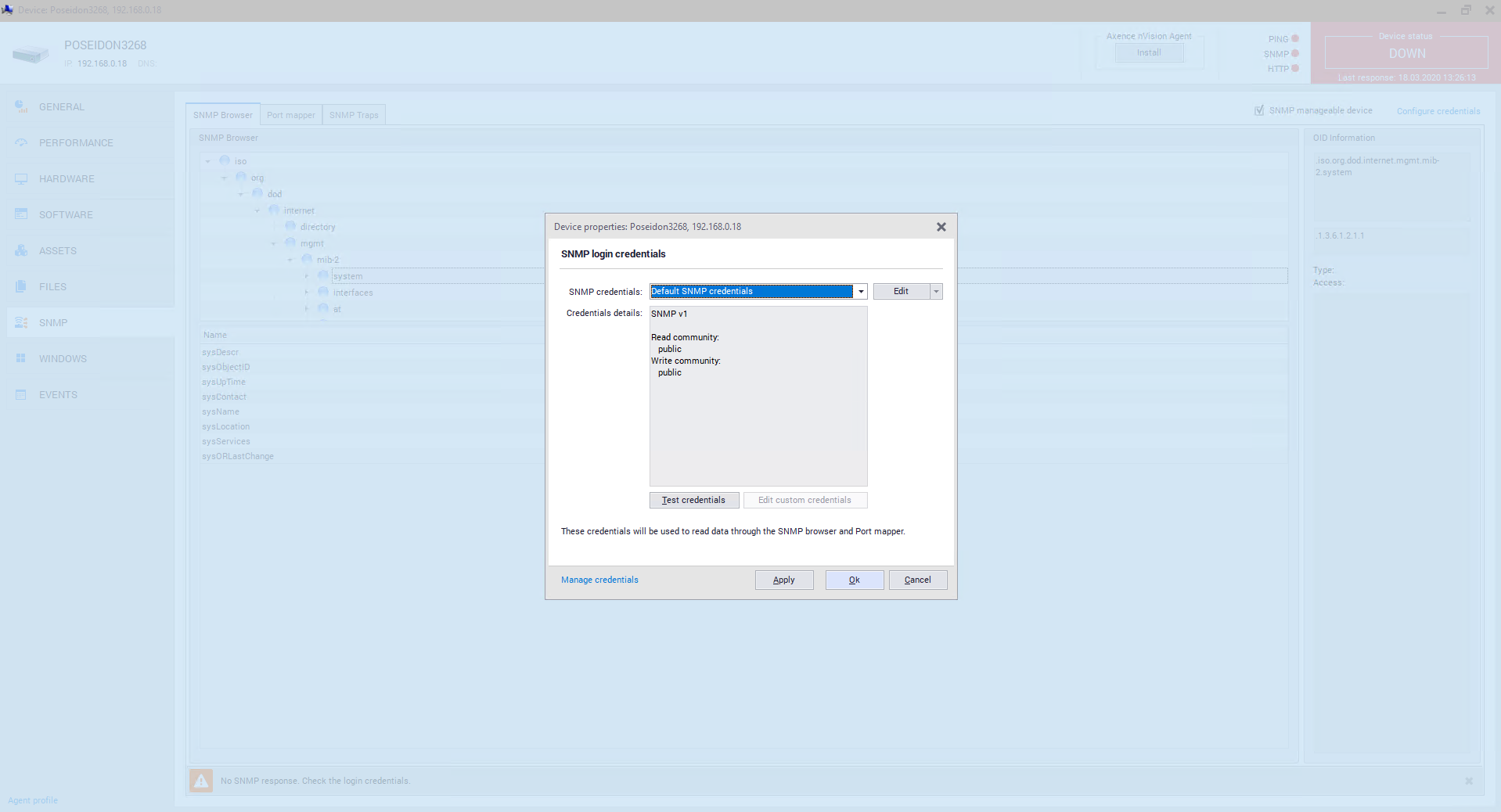To monitor SNMP, you also need to provide the SNMP community. You can specify the community in the Host info window on the SNMP tab.