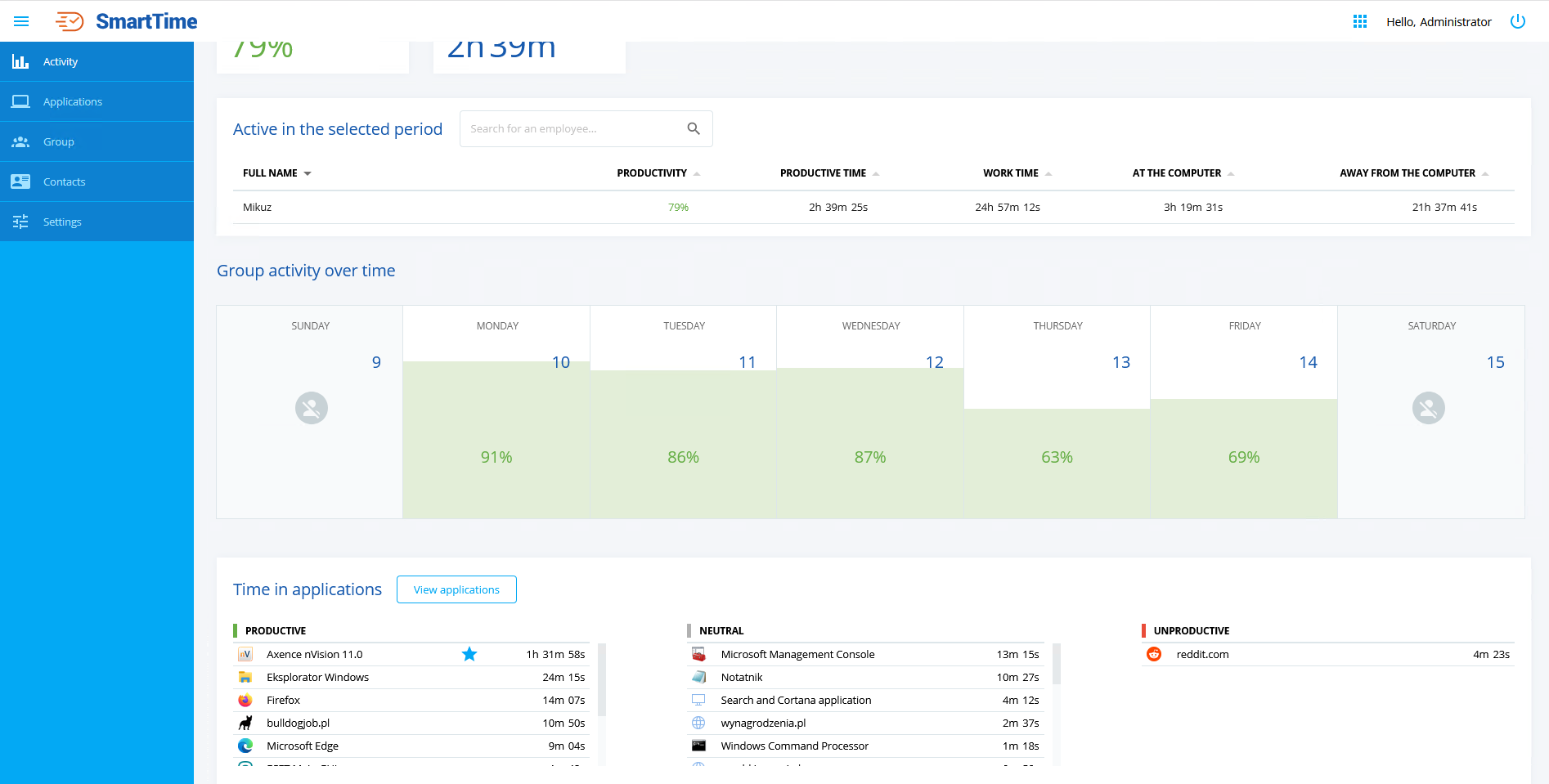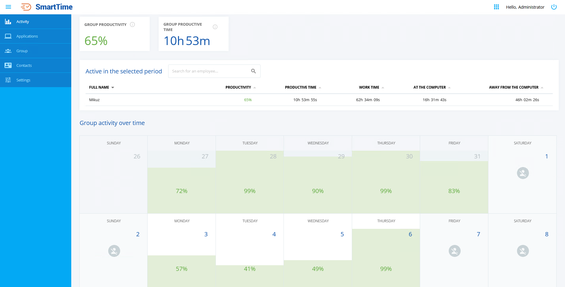 When displaying the group activity for a period longer than one day, one more section is added to the statistics described in the previous chapter, named Group activity in a given period. This part of the screen shows the grid indicating the group productivity in the selected time period. After clicking the selected tile, you will be moved to the detailed data for the selected day.