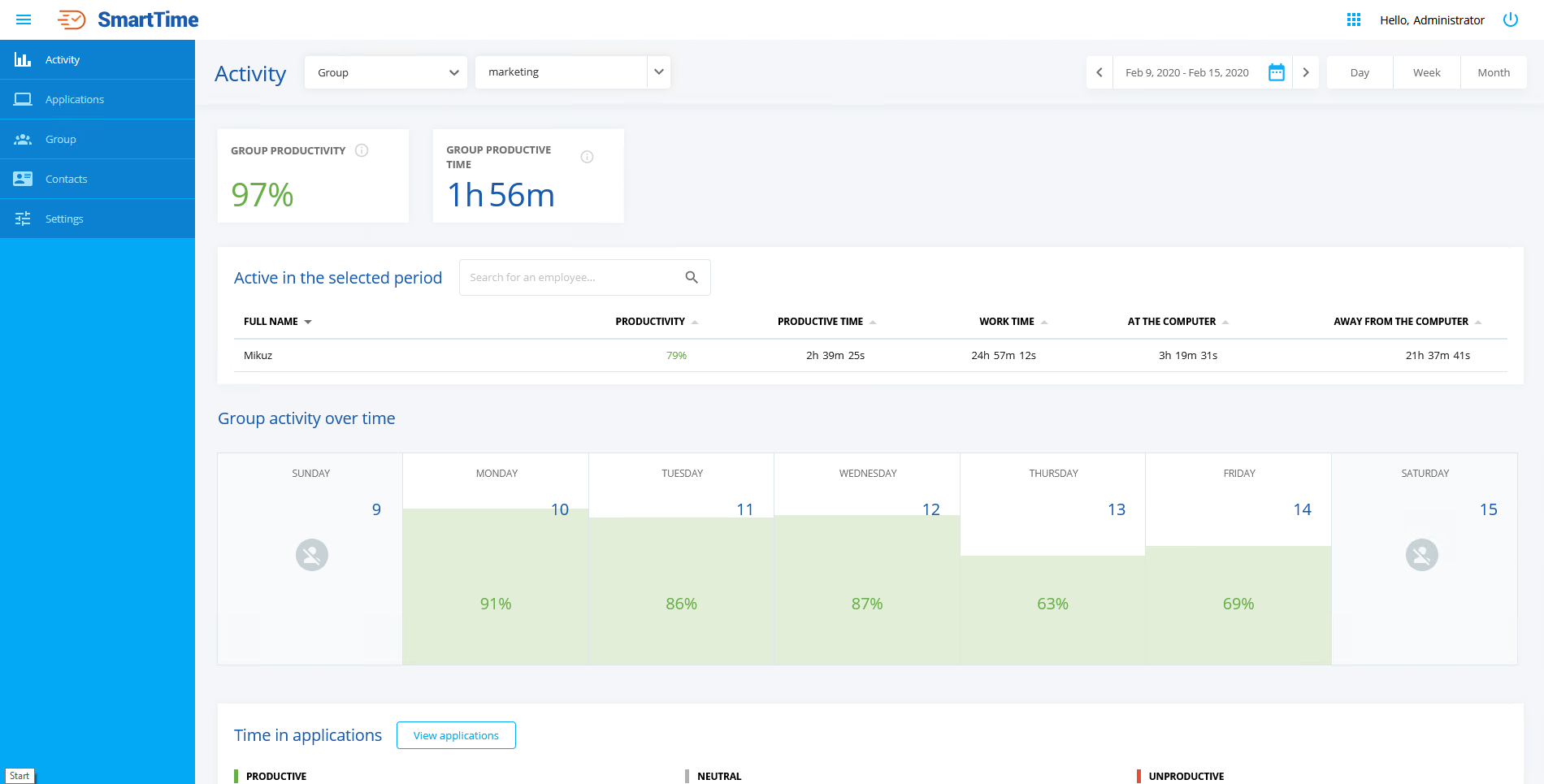 After clicking the View productivity button, the application will take you to the page where the information on the productivity of the group as a whole and of individual members is displayed.