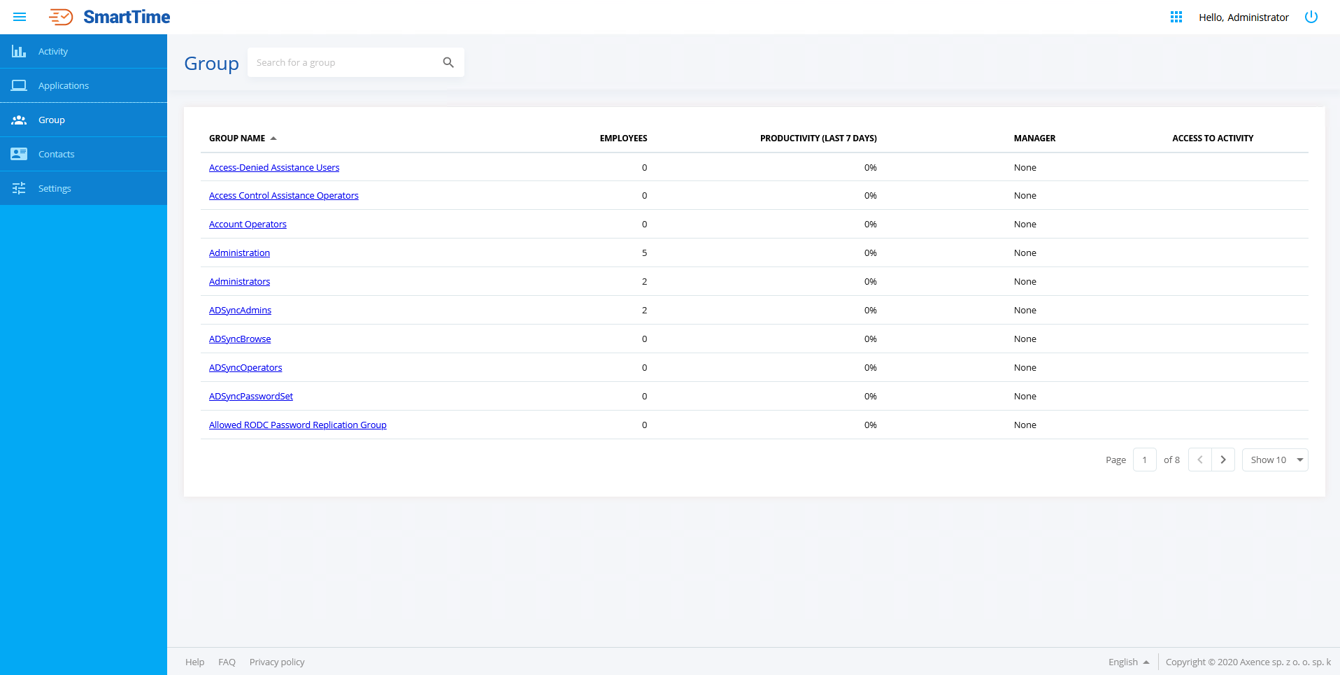 After selecting an item from the list of groups, you can go to detailed information. The following tabs are available there: •Employees – a list of employees belonging to the group or subgroup (see the “relationship within the group” column), •Belongs to – information about the parent group that the currently viewed group belongs to (this item is not displayed if the selected group does not belong to any other group), •Subgroups – information about the subgroups of the currently viewed group, •Application exceptions – provides information on whether or not any exceptions are defined for this group. The list of exceptions only includes the applications in which the members of the selected group were active. This tab also allows you to add exceptions for these applications.