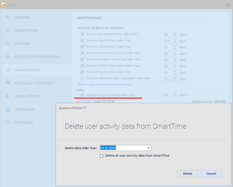 To delete the activity data collected in the SmartTime module, navigate to the main options of nVision and then to the Maintenance tab: