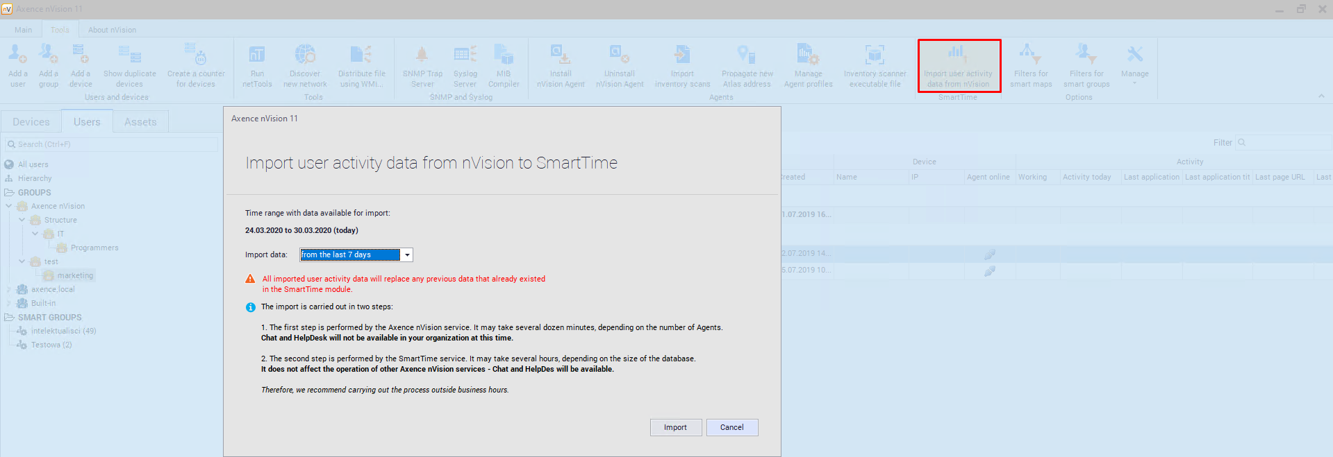 To do this, navigate to the Tools tab and select Import activity data from nVision in the SmartTime section. The program will require you to specify the time from which the activity data are to be imported: Note! All imported user activity data will replace the data collected by SmartTime over the selected period.