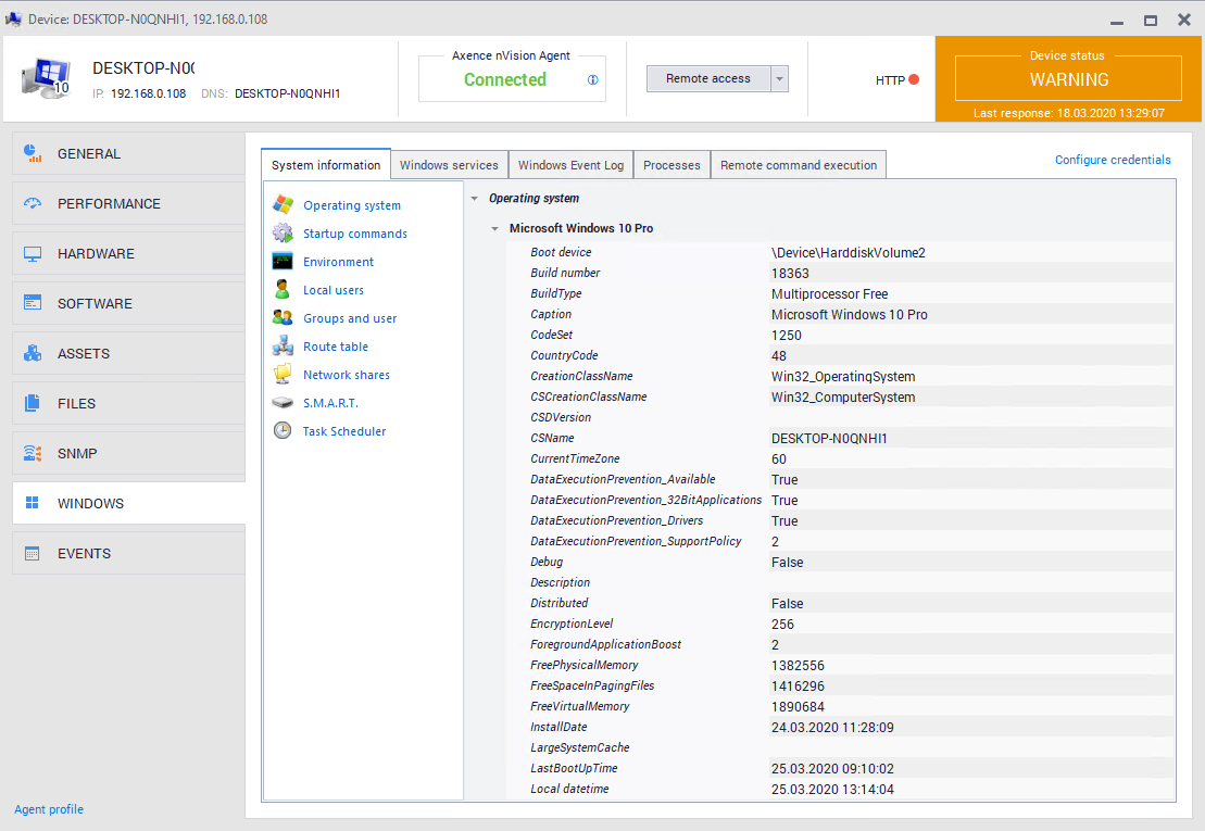 System information are collected by the nVision Agent. To gather this data, you must install Agents on all computers that you want to monitor. To go to the system information window, select the device and go to the Device Information window. Then select the Windows tab.