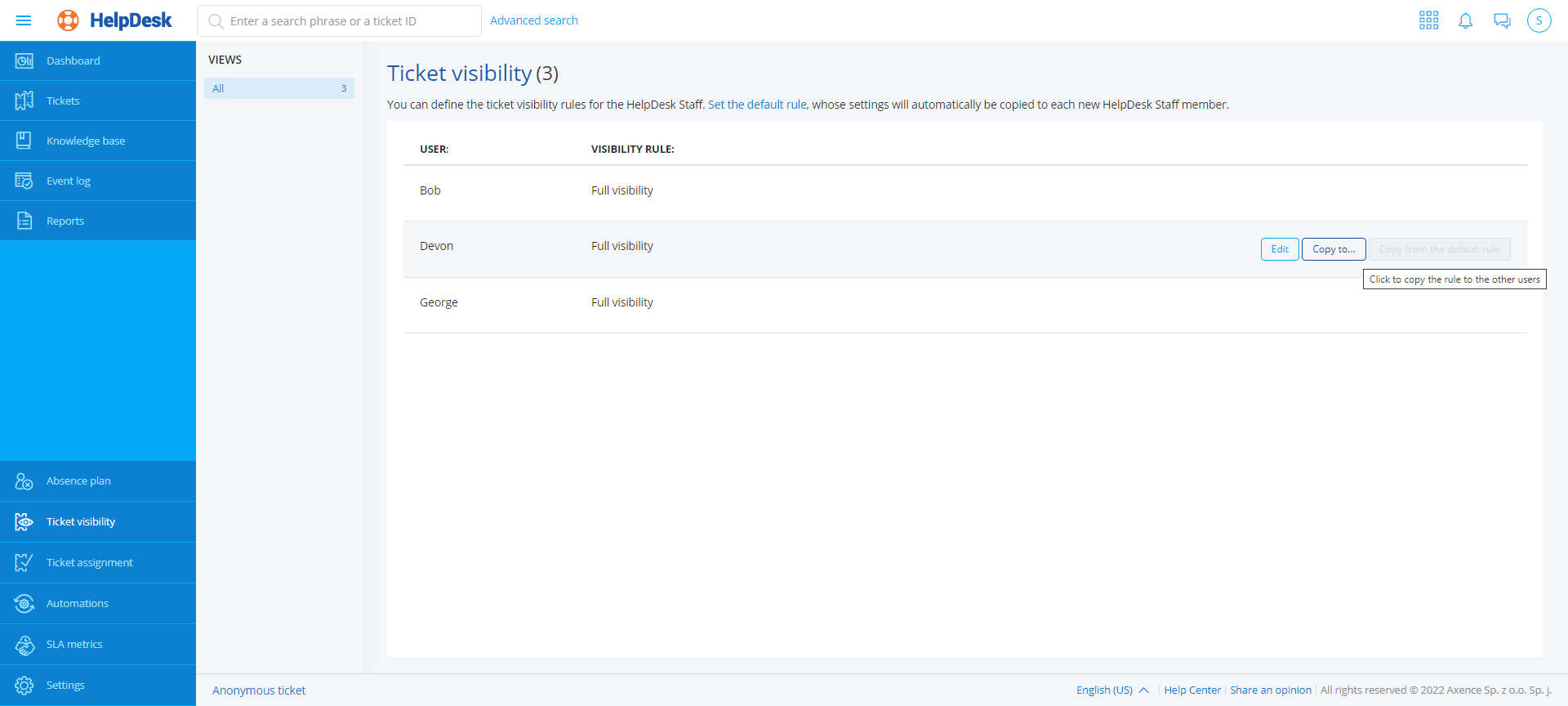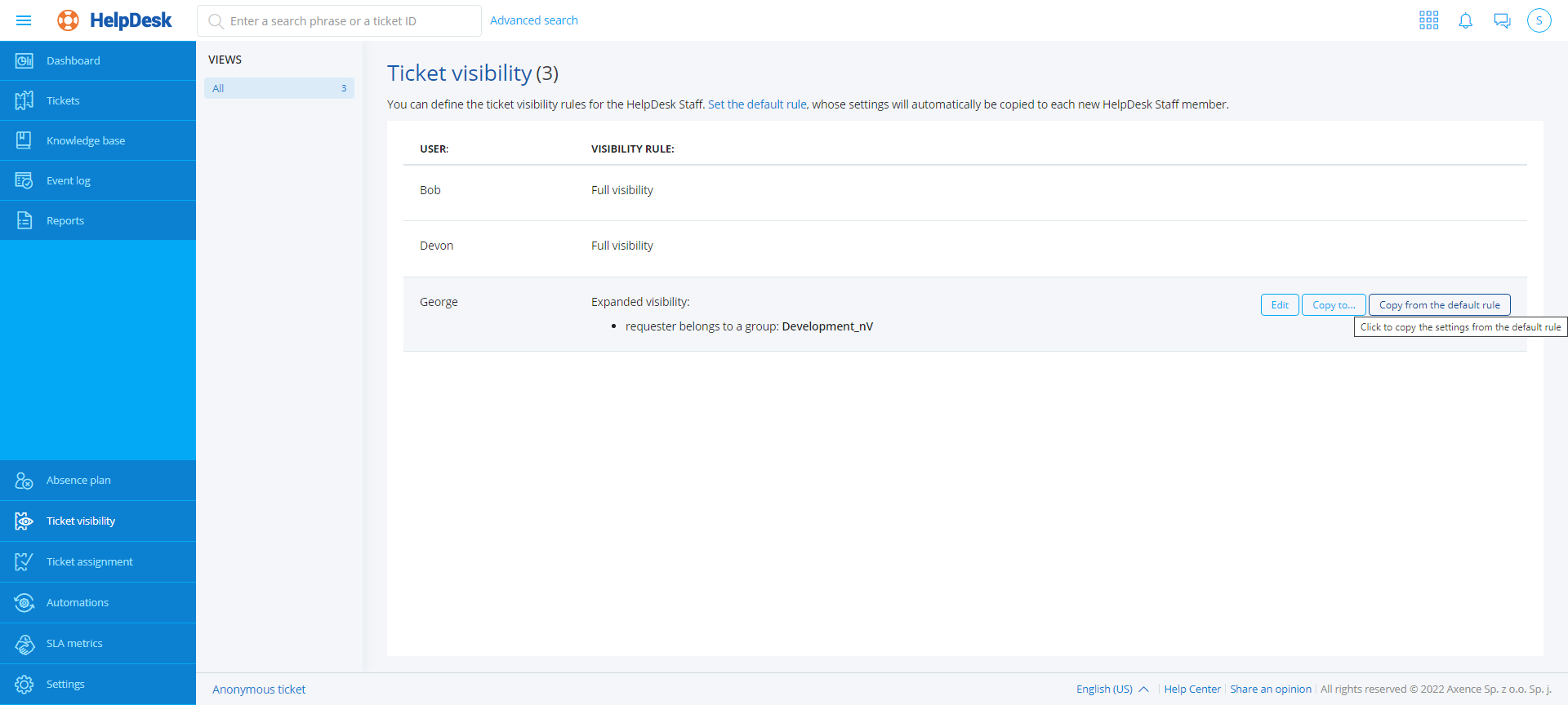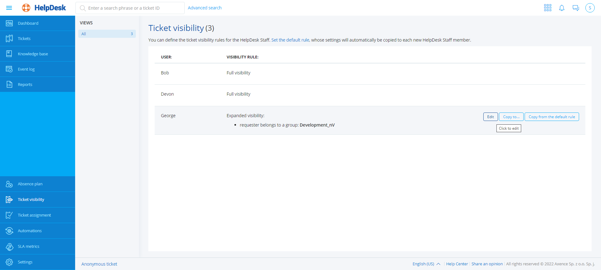 2. Select the HelpDesk Employee whose visibility rule you want to edit (when you hover over the field of the relevant HelpDesk Employee, the Edit, Copy to..., Copy from default rule buttons are displayed).