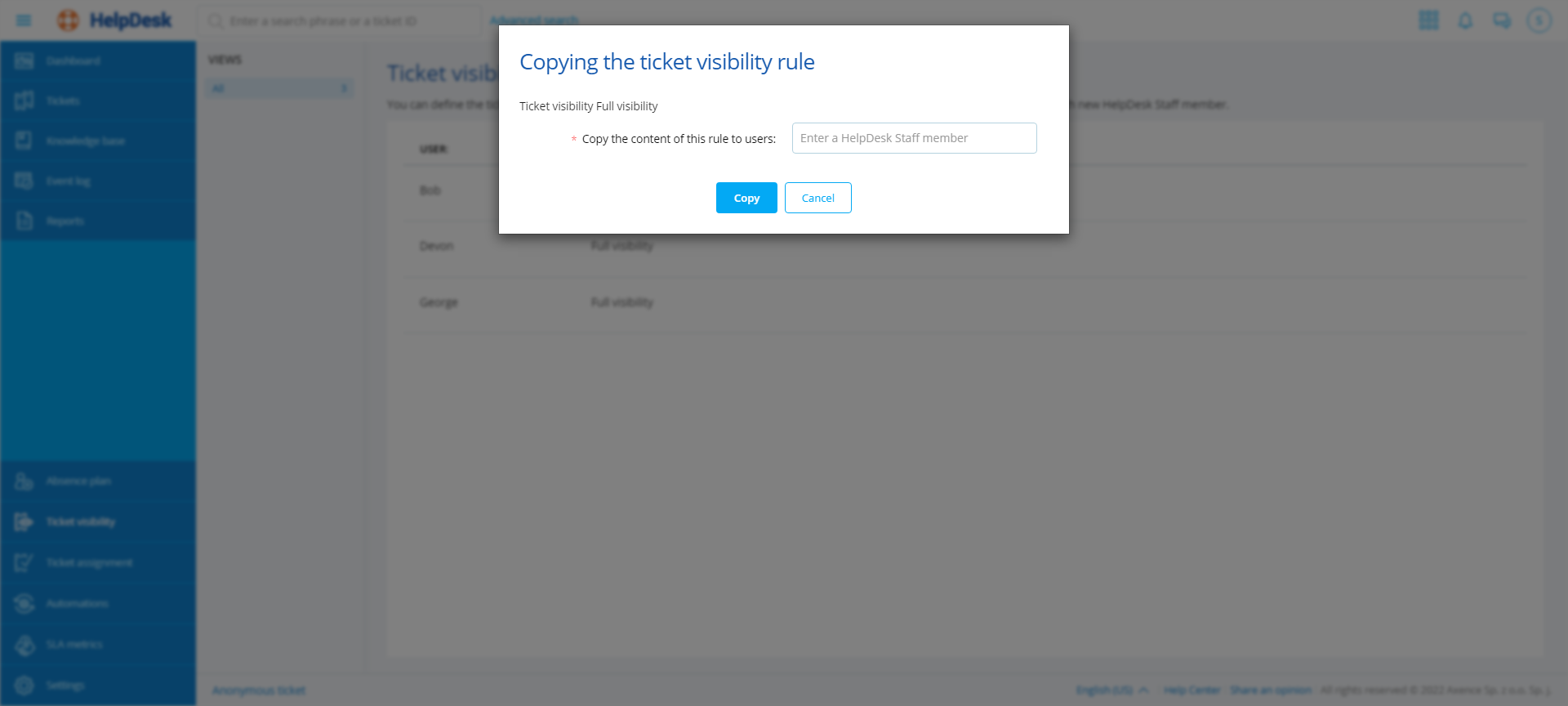 4. In the ticket visibility copying window, select the HelpDesk employee to copy the rule to (you can select more than 1 employee), and then click the Copy button.