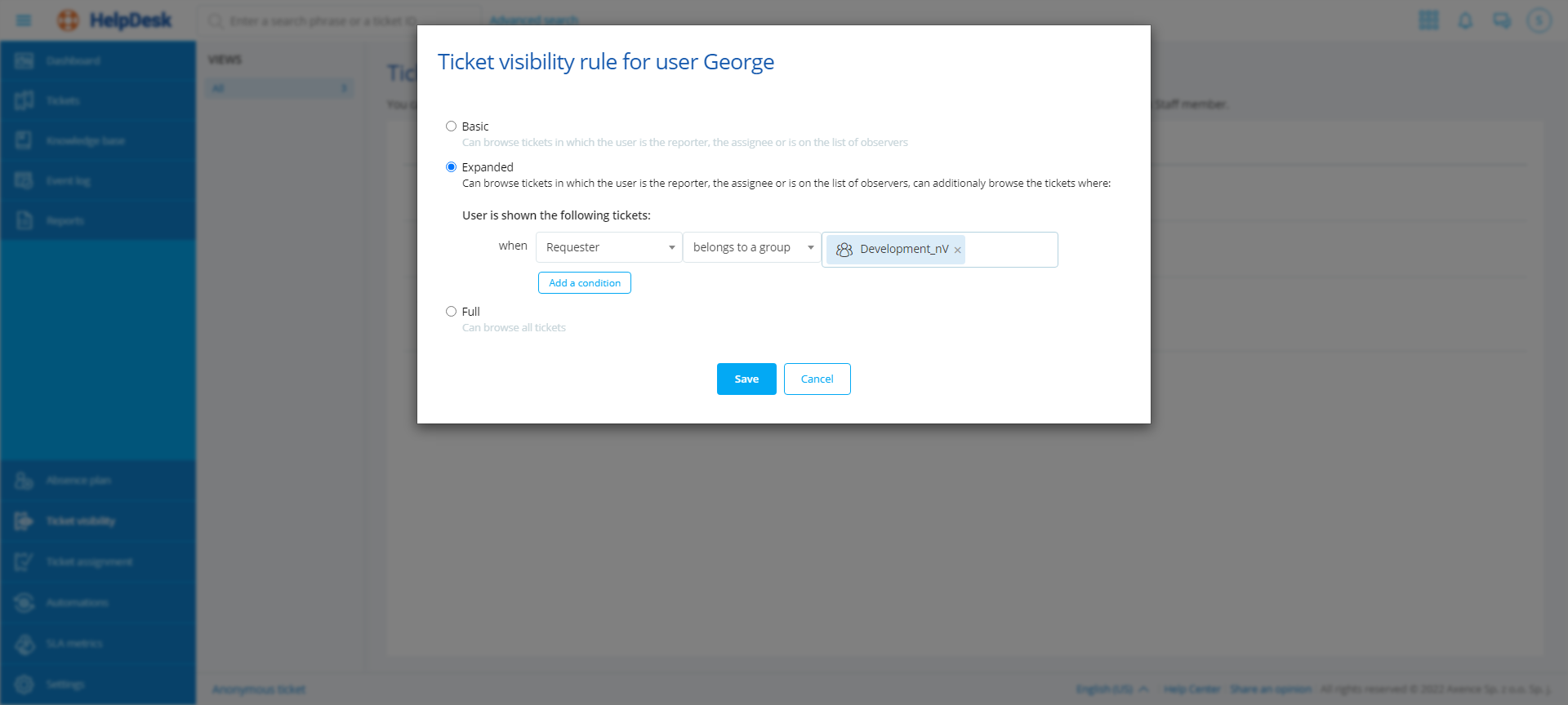 1.Full visibility - selected user will have access to all trouble tickets 2.Restricted visibility - selected user will have access to tickets which satisfy conditions. The following conditions are available: