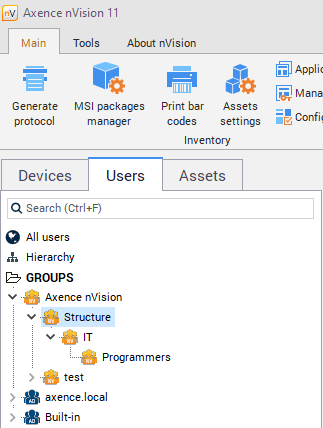 Trustees (trusted units) are workstations and computer groups for which the access rights are defined. Depending on the trust level, units can have various rights assigned. To learn more on the access rights, see section Access rights. User groups Defining separate access rights for each user would be a time consuming operation. Therefore, grouping the individual workstations into maps created by the system administrator is recommended. If the created map structure reflects the real interdependencies between the users, it is possible to set the access rights in a quick manner. An example of map structure is presented below. To learn more on the calculation of effective access rights for the above structure, see section Example of structure. There are two methods to manage the access rights: •Management from the level of the properties of a given user, group or atlas – Managing via user hierarchy •Management with the Managing trustees function |