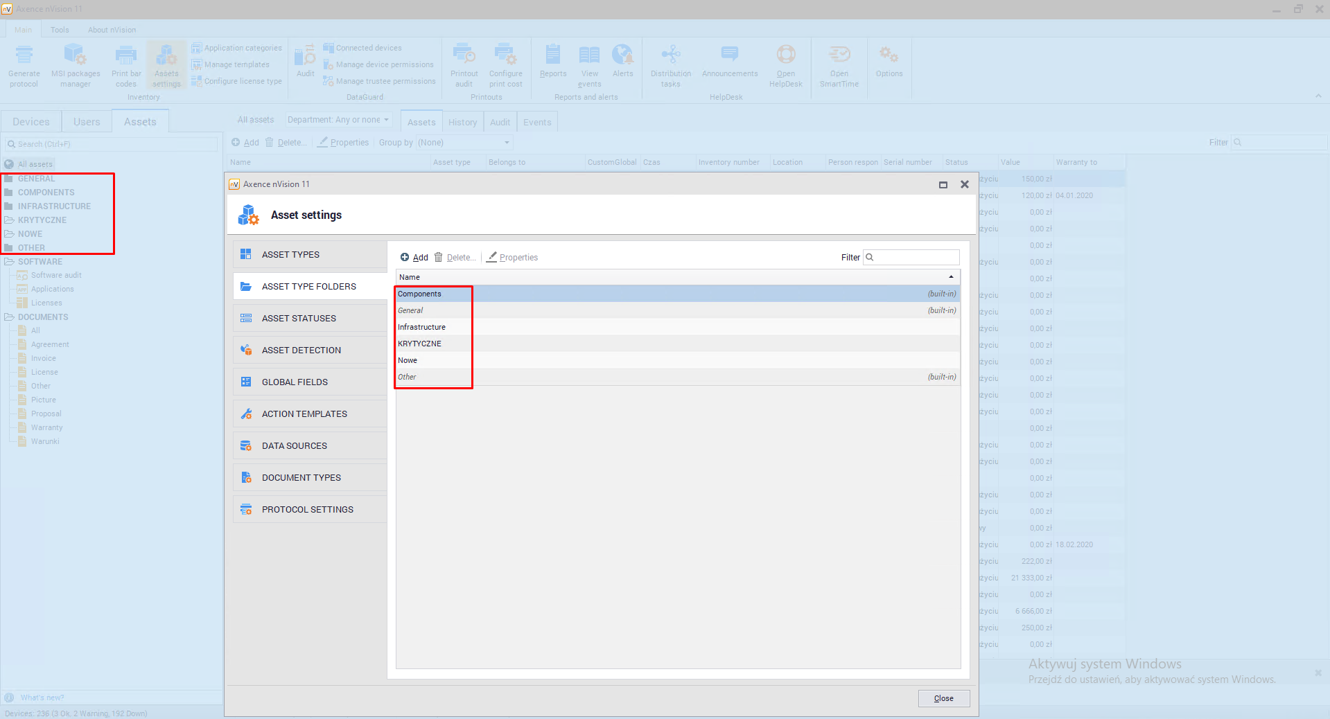 Asset type folders allow the Administrator to assign types to organizational units. The Assets tab, available from the main program window, allows you to display the folders and their types. It is possible to display and modify the list of available folders. To do so, go to Asset settings window and then to the Asset Type Folder tab, you can display and modify the list of available folders: